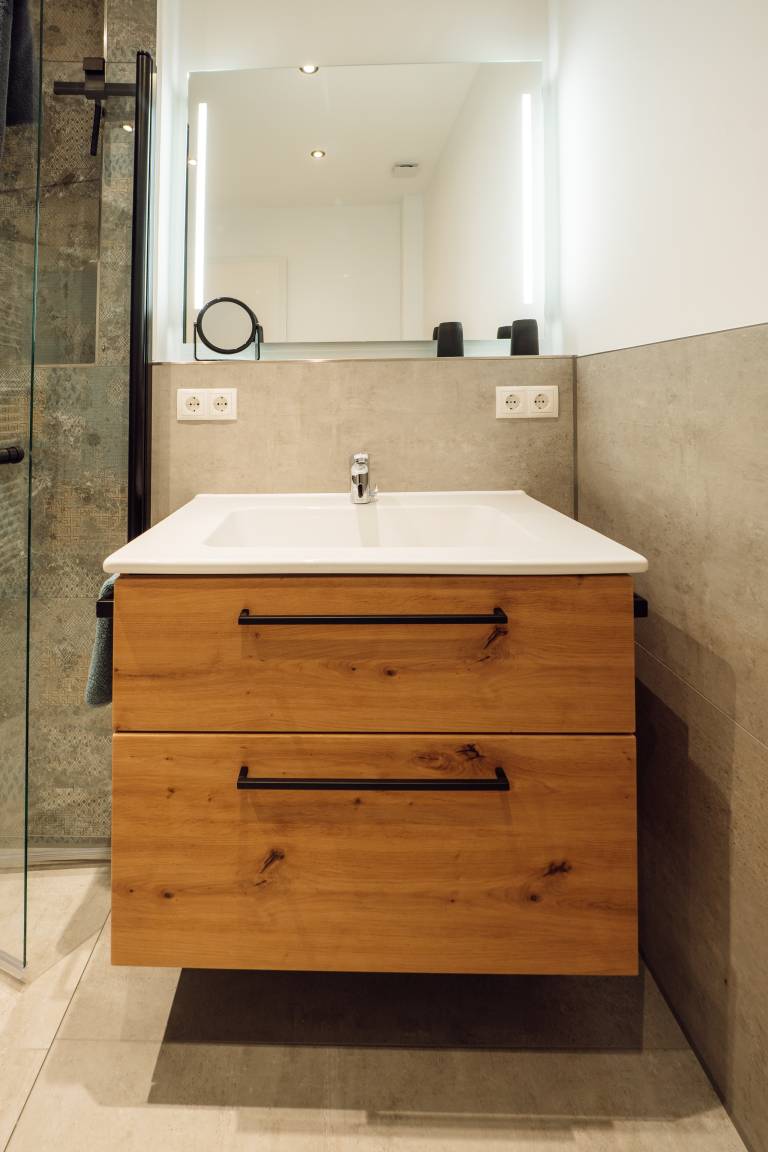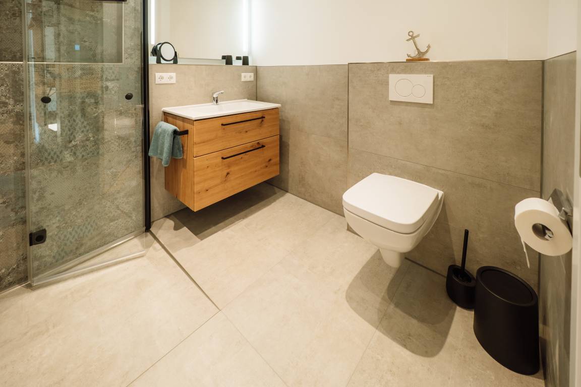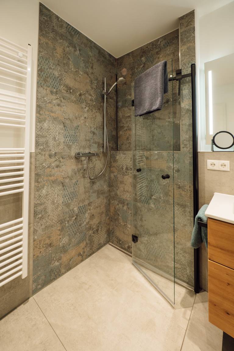 Im Schlafzimmer erwarten dich erholsame Nächte in ruhiger Umgebung, während das moderne Bad mit bodengleicher Dusche den Tag stilvoll beginnen lässt.