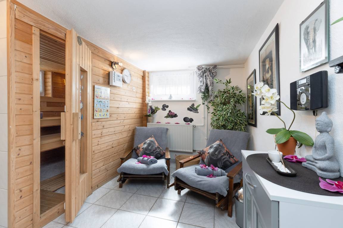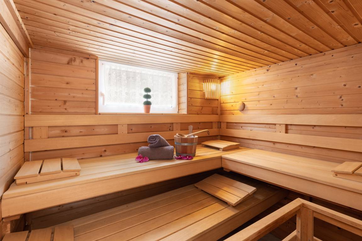 In der kälteren Jahreszeit bietet die gemütliche Sauna mit kleinem Ruhe-Bereich herrliche Entspannung.