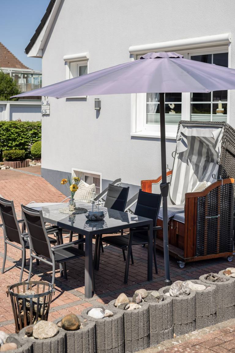 Auf der schönen 50 m² Sonnenterrasse im Garten lässt es sich wunderbar entspannen – mit bequemen Liegen, Strandkorb und Grillmöglichkeit.