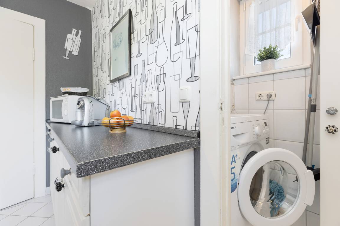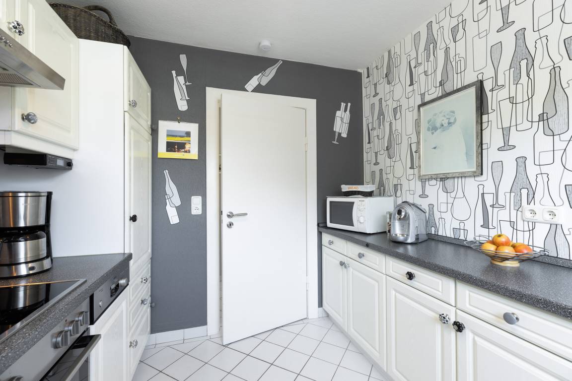 Die voll ausgestattete separate Küche mit Spülmaschine, Kaffee- und Espresso-Maschine, Wasserkocher, Milchaufschäumer, Mikrowelle, Ceranfeld und Backofen lässt keine Wünsche offen.