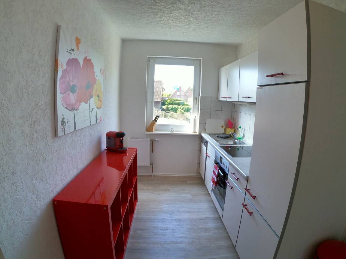4-Plattenherd, Backofen, Eierkocher, Mikrowelle, Kaffeemaschine und vielen weiteren Küchengeräten ausgestattet. Beide Schlafzimmer sind mit einem Doppelbett (180 x 200 cm - durchgehende Matratze) sowie einem großen Kleiderschrank versehen. Das Tageslicht-Badezimmer ist mit Waschbecken, Dusche & WC ausgestattet - (Fön vorhanden).