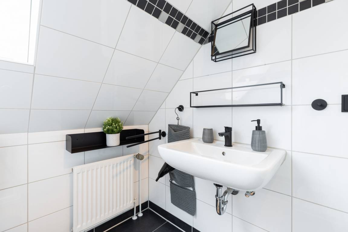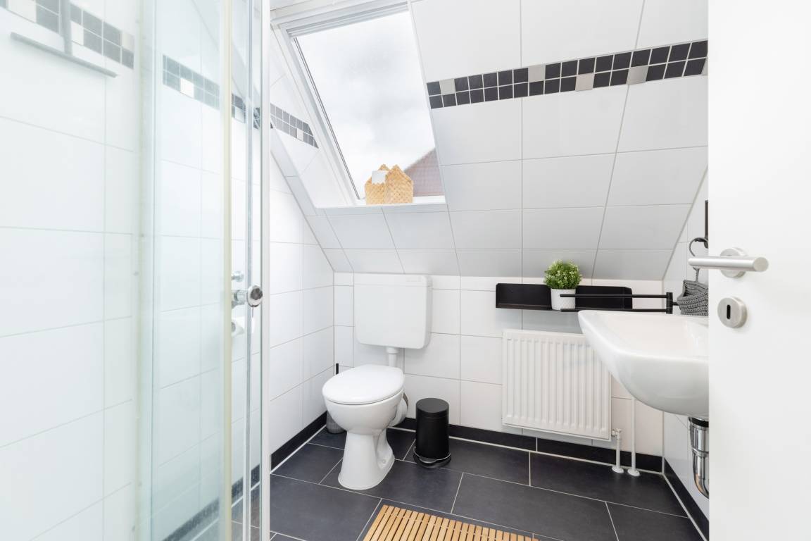 Das Duschbad erhält Tageslicht durch ein großes Dachflächenfenster.