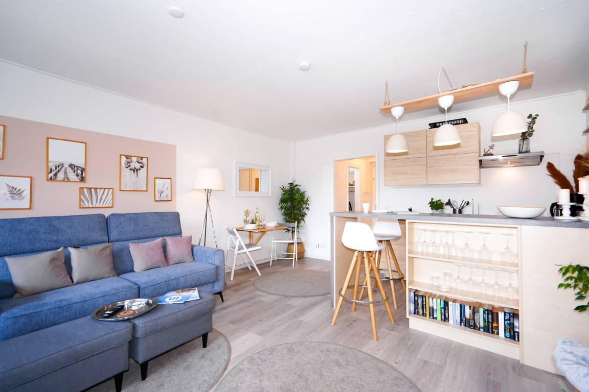 Diese Wohnung wurde vollständig modernisiert und erstrahlt in angenehm warmen Pastelltönen mit neuen Möbeln und Fußböden aus Vinyl. Die Küche und das Badezimmer sind ebenfalls komplett erneuert. Das Wohn/-Schlafzimmer ist mit einem hochwertigen Schlafsofa (140 cm x 200 cm) aus 2025, einem Lowboard, Beistelltischen und diversen Wohnaccessoirs ausgestattet, die den Raum sehr gemütlich wirken lassen.