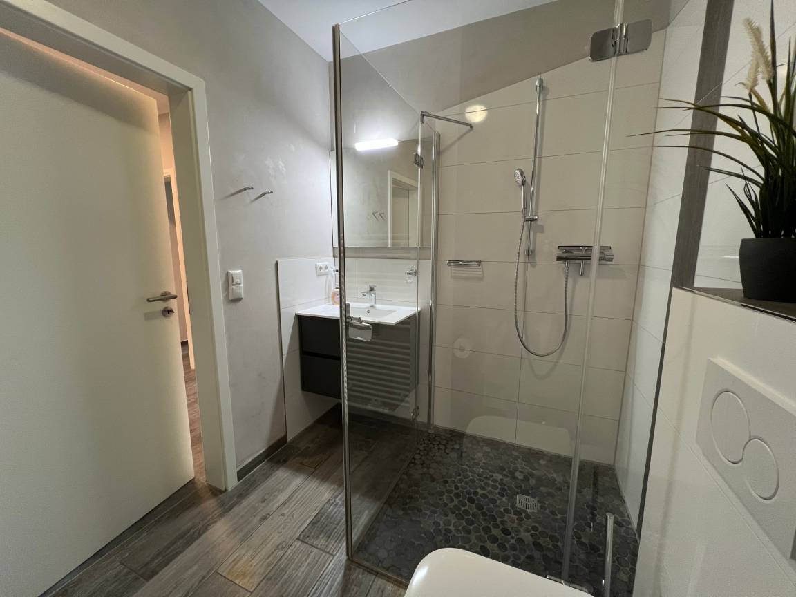 Die im Industrielook eingerichtete 71 qm große Ferienwohnung befindet sich im Erdgeschoss. Das Wohnzimmer ist mit einer hochwertigen Schlafcouch (160cm x 190cm) für weitere 2 Personen und mit einem großzügigen Esstisch mit sechs Stühlen ausgestattet und hat direktem Zugang zur Terrasse. Die offene Küche verfügt u.a. über einen Geschirrspüler, einen Herd mit Backofen auf Augenhöhe, einen Kühlschrank mit Gefrierfach, einen Wasserkocher, einen Kaffeeautomat und einen Toaster.