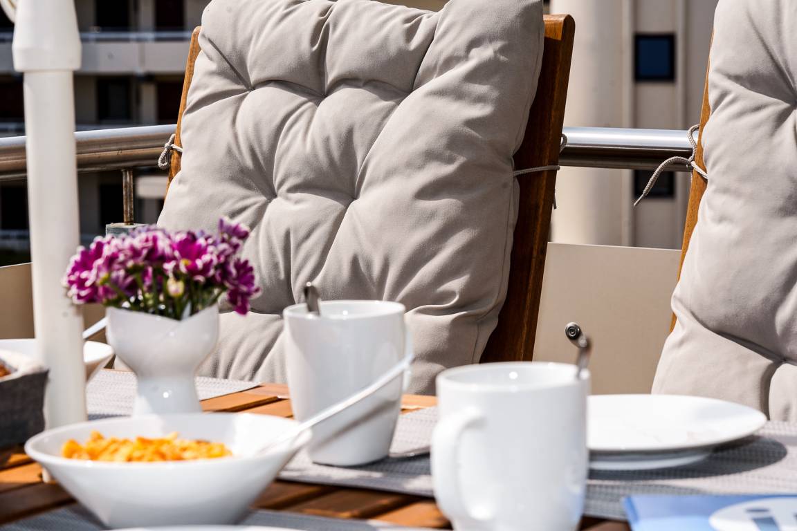 Auf dem Balkon, welcher über einen großen Tisch mit vier Stühlen verfügt, können Sie die Sonne genießen. Ein Teilseeblick ist hier inbegriffen.