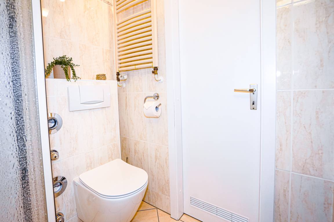 Das Schlafzimmer ist mit einem bequemen neuen Doppelbett (180x200, durchgehende Matratze), einem Kleiderschrank und zwei Nachttischen möbliert. Im geschmackvollen Badezimmer finden Sie eine Runddusche, WC und Waschbecken sowie einen großen Spiegelschrank vor.
