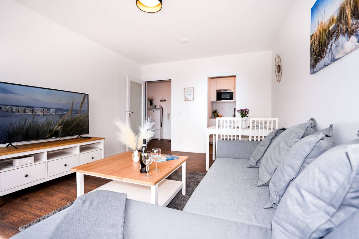 Das Wohnzimmer ist mit einer Schlafcouch, einem Esstisch und einem großen Fernseher ausgestattet. Kostenloses W-LAN steht Ihnen hier selbstverständlich zur Verfügung. Die an das Wohnzimmer angrenzende neue Küche ist mit einer Spülmaschine, Kühlschrank mit Gefrierfach, Mikrowelle und einem Herd mit zwei Kochfeldern ausgestattet.