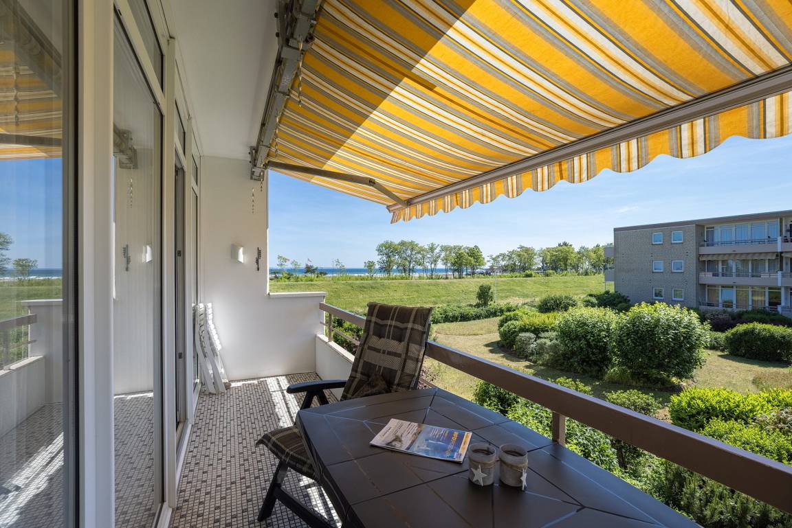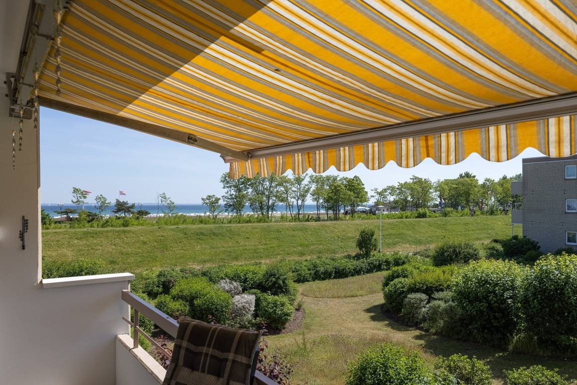 Balkon mit Markise in westliche Richtung mit seitlichem Seeblick, PKW-Abstellplatz, Fahrradraum, Waschmaschinen und Trockner im Haus (gegen Gebühr).