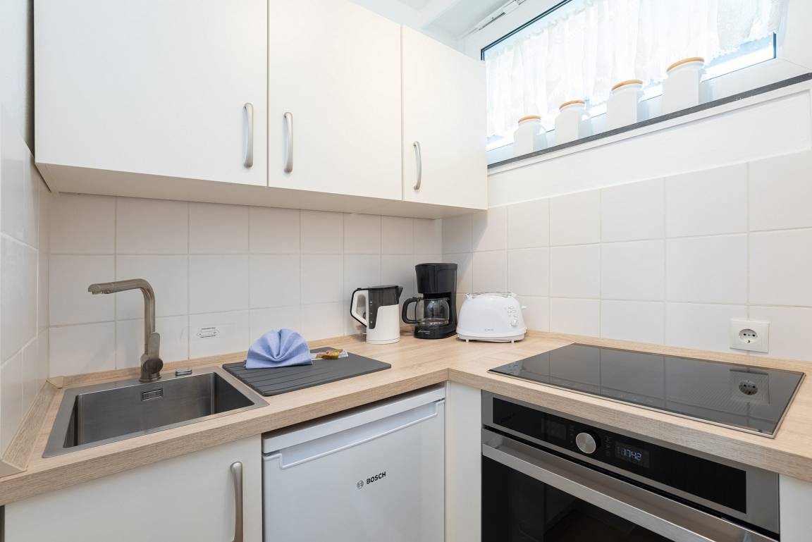 Moderne, komplett ausgestattete Küche mit einem Cerankochfeld, Kühlschrank mit kleinem 3-Sterne Gefrierfach, Backofen, Wasserkocher, Kaffeemaschine und Toaster.