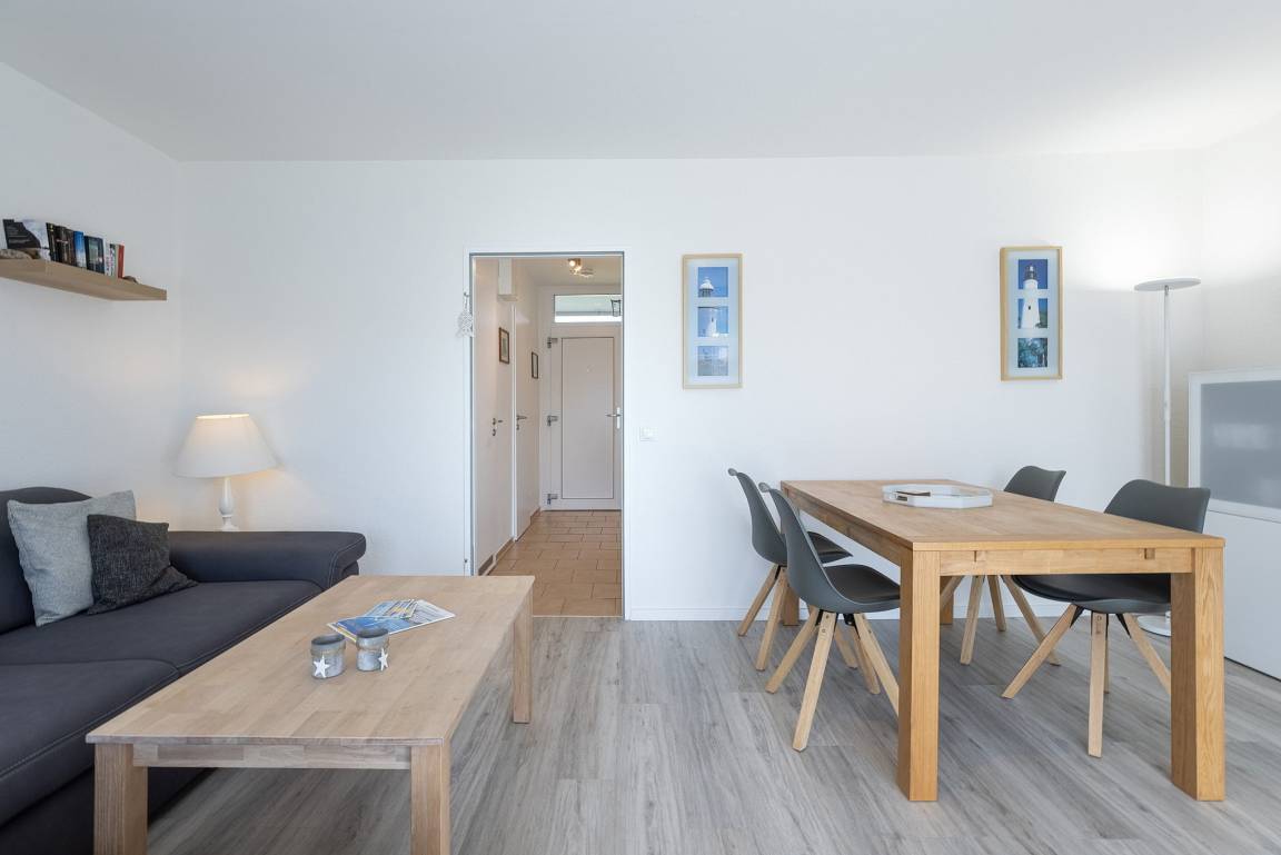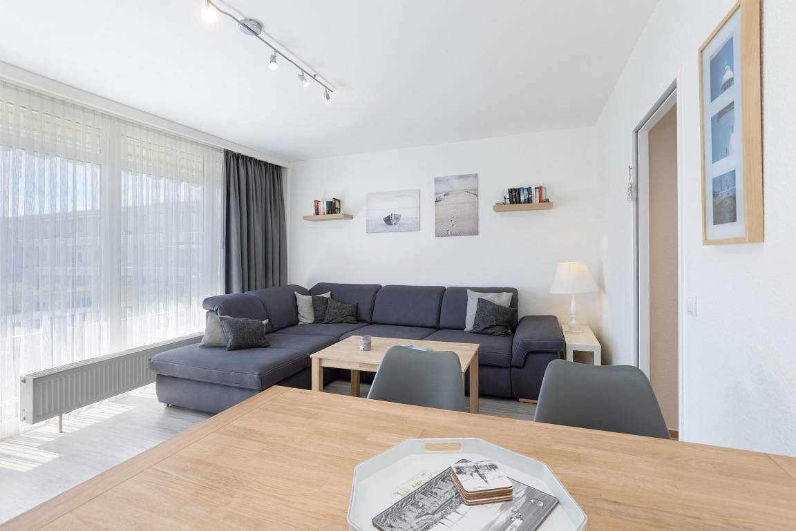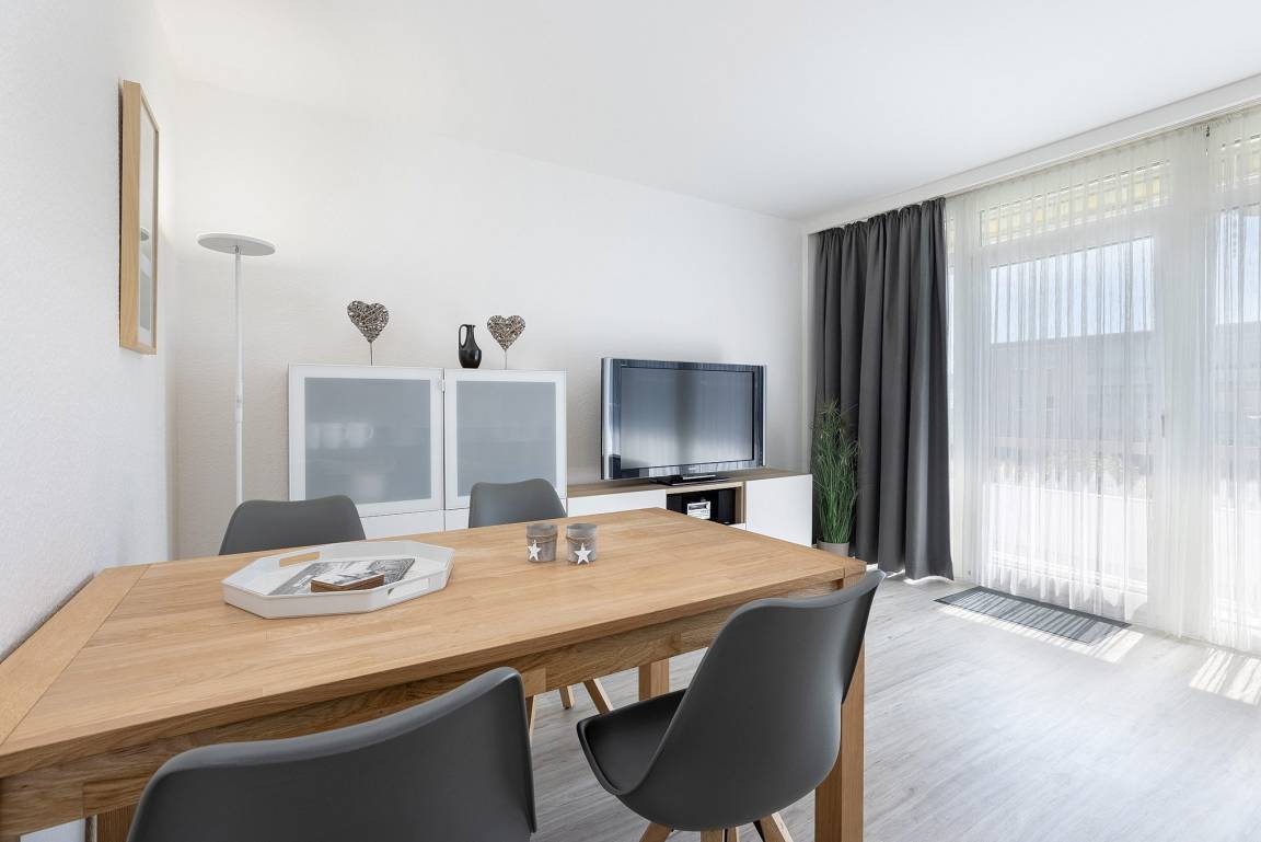 Modernes, helles Wohn- und Esszimmer mit direktem Zugang zum Balkon. Das Wohn- und Esszimmer ist mit Laminatboden ausgelegt. Das Wohn- und Esszimmer ist mit einem Leder-Schlafsofa mit Bettfunktion (Liegefläche 157 x 231cm), einem Esstisch für 4 Personen und einer Schrankwand ausgestattet. Zur Unterhaltung steht ein Fernseher, ein DVD-Player und eine Mini-Stereoanlage mit Radio, CD und Kassettenfach zur Verfügung.