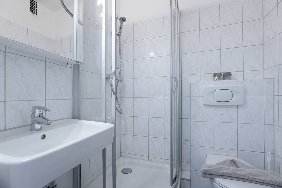 Modernes, freundliches, hell gefliestes Bad mit Dusche, WC, Handtuchheizung und Waschbecken.
