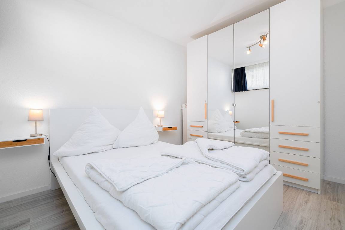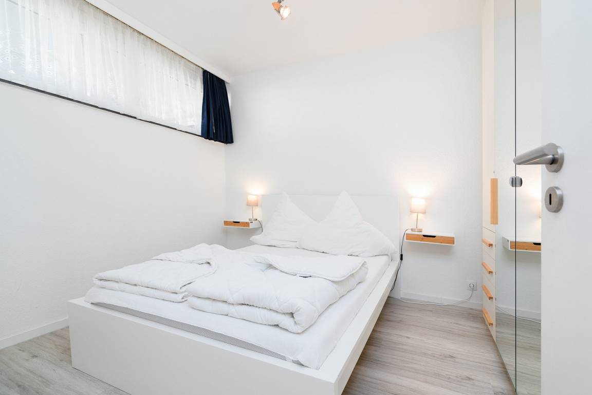 Freundliches Schlafzimmer mit Laminatboden und Fenster zum Laubengang. Das Schlafzimmer ist mit einem modernen, großen Kleiderschrank und einem Doppelbett (140x200cm) ausgestattet. Das Fenster lässt sich durch einen Vorhang etwas verdunkeln.