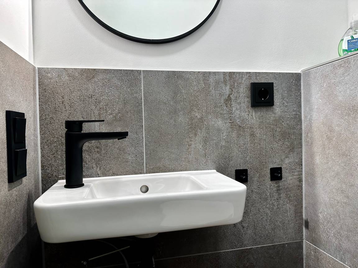 Das anliegende, geräumige Duschbad wurde 2023 komplett neu gestaltet. Das moderne Design kommt durch ein Dachflächenfenster mit reichlich Tageslicht besonders ansprechend zur Geltung.