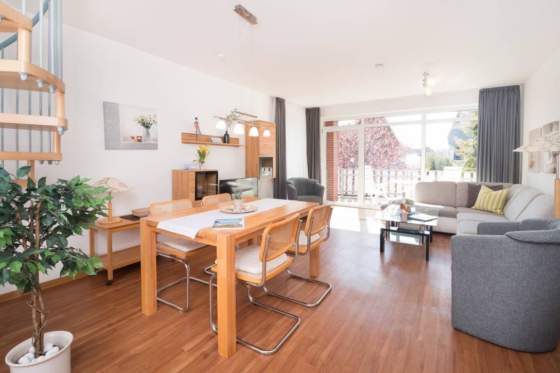 2020 NEU GESTALTET: Maisonette-Wohnung in zentraler und strandnaher Lage (200 m zum Kurzentrum und Hauptstrand) im 1. und 2. Obergeschoss für bis zu 4 Personen auf 64 m² Wohnfläche mit 1 Schlafzimmer (Boxspringbett), 1 Wohn-Schlafraum (Schlaf-Couch) und einem zusätzlichen kleinen Schlafraum (Bett 90 x 200 cm) .