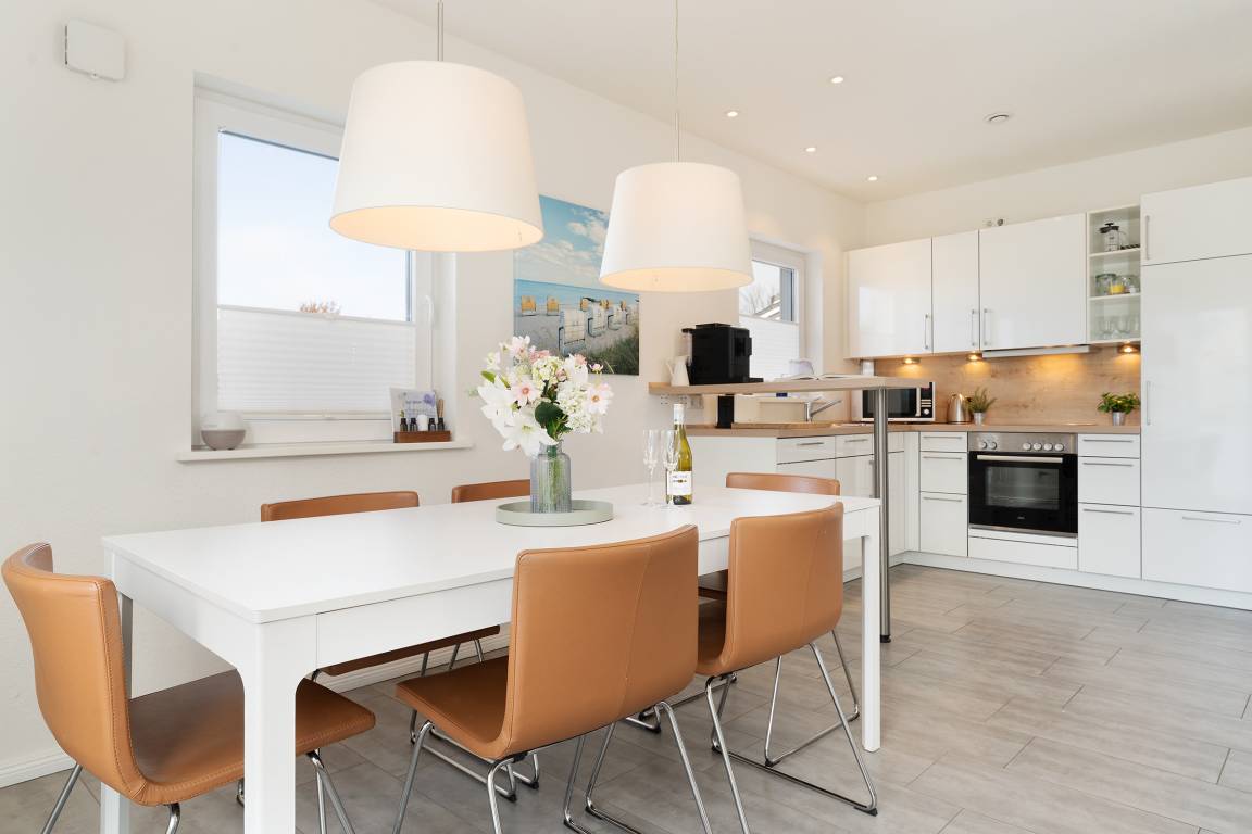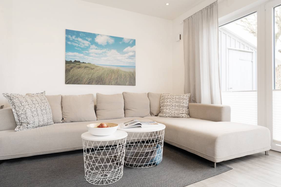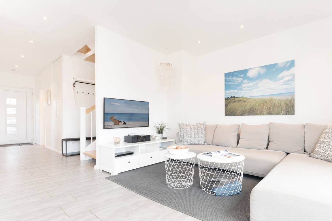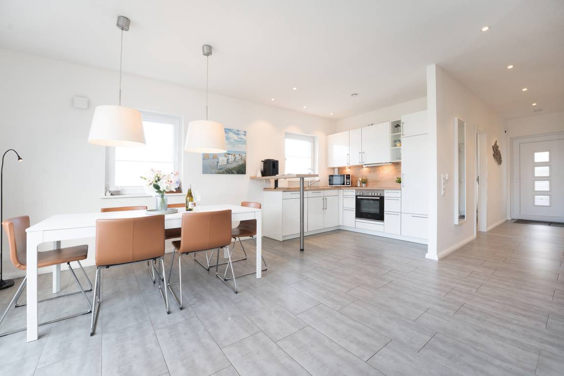 Beim Betreten des Ferienhauses gelangen Sie in den weitläufigen Wohnbereich, der mit bequemer Sofaecke, TV und viel Tageslicht zum Verweilen einlädt. Von hier aus haben Sie Zugang zur Terrasse, auf der Sie sonnige Stunden an der frischen Ostseeluft genießen können – perfekt für ein Frühstück im Freien oder einen entspannten Tagesausklang. Die offen gestaltete Küche ist vollständig ausgestattet und bietet alles, was Sie für die Zubereitung Ihrer Mahlzeiten benötigen. Der angrenzende Essbereich lädt zu gemeinsamen Essen und geselligen Abenden ein. Das Ferienhaus verfügt über drei separate Schlafzimmer, die jeweils komfortabel eingerichtet sind und erholsamen Schlaf garantieren – ideal auch bei voller Belegung. Das moderne Badezimmer rundet den Rundgang ab und bietet ausreichend Platz für die tägliche Urlaubsroutine.