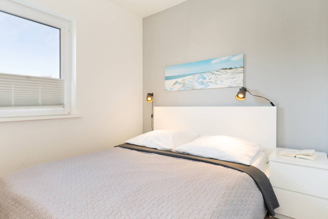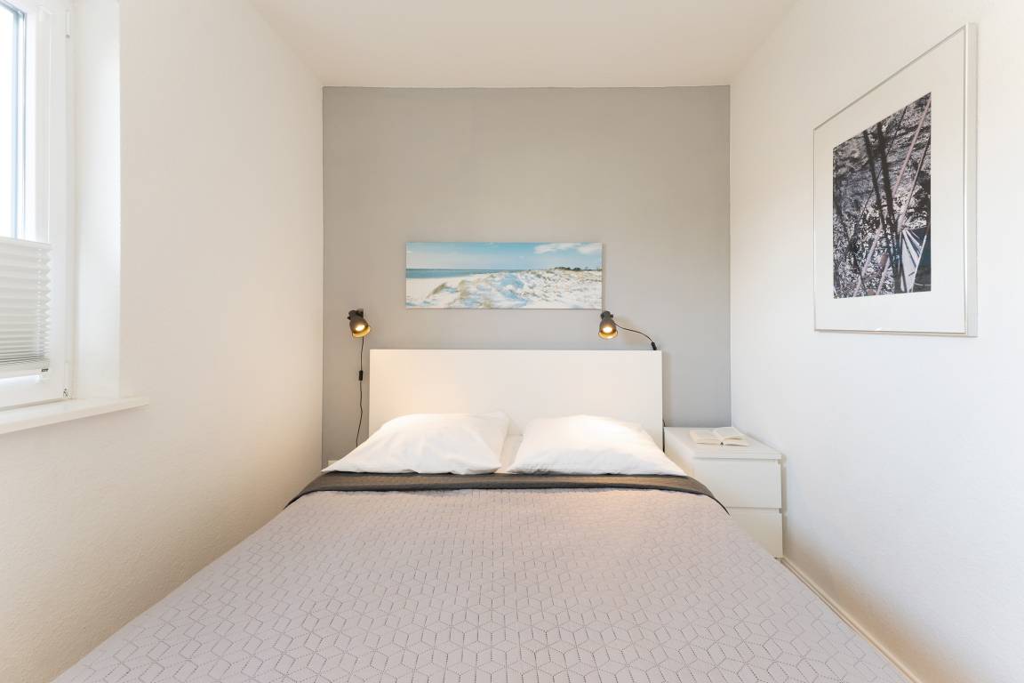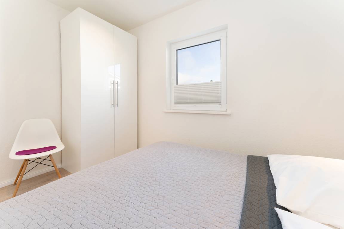 Schlafzimmer 1 (EG): 1 Doppelbett (160x200 cm), Kleiderschrank, Verdunkelung: Plissee, kein Platz für ein Babybett vorhanden