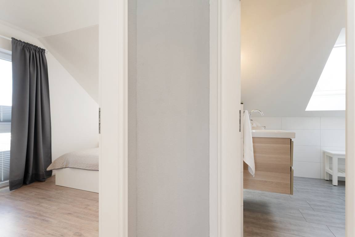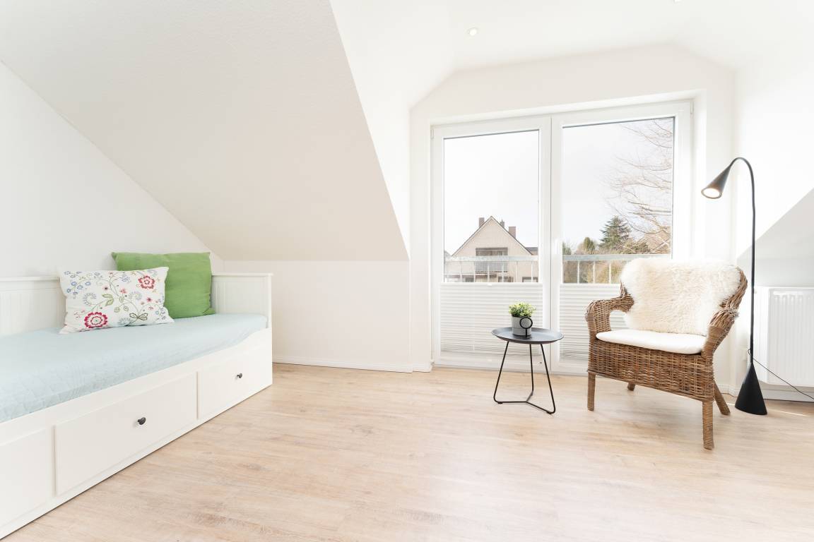 Schlafzimmer 3 (OG): 1 Doppelbett (160x200 cm), 1 Einzelbett (90x200 cm), Kleiderschrank, Verdunkelung: Plissee und Vorhang, Platz für ein Babybett vorhanden
