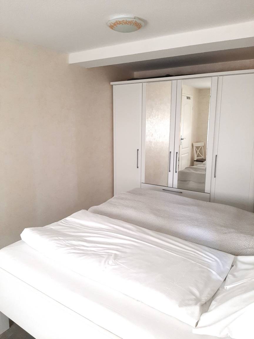 Die Küchenzeile ist mit einem 4 Platten Ceranfeld und einem Kühlschrank mit Gefrierfach ausgestattet. Eine Mikrowelle, Kaffeemaschine, Toaster und Wasserkocher, Geschirr, Töpfe, Pfanne und Gläser gehören auch dazu. Im Schlafzimmer stehen ein großes Doppelbett und ein Kleiderschrank. Das Bett hat Komforthöhe.