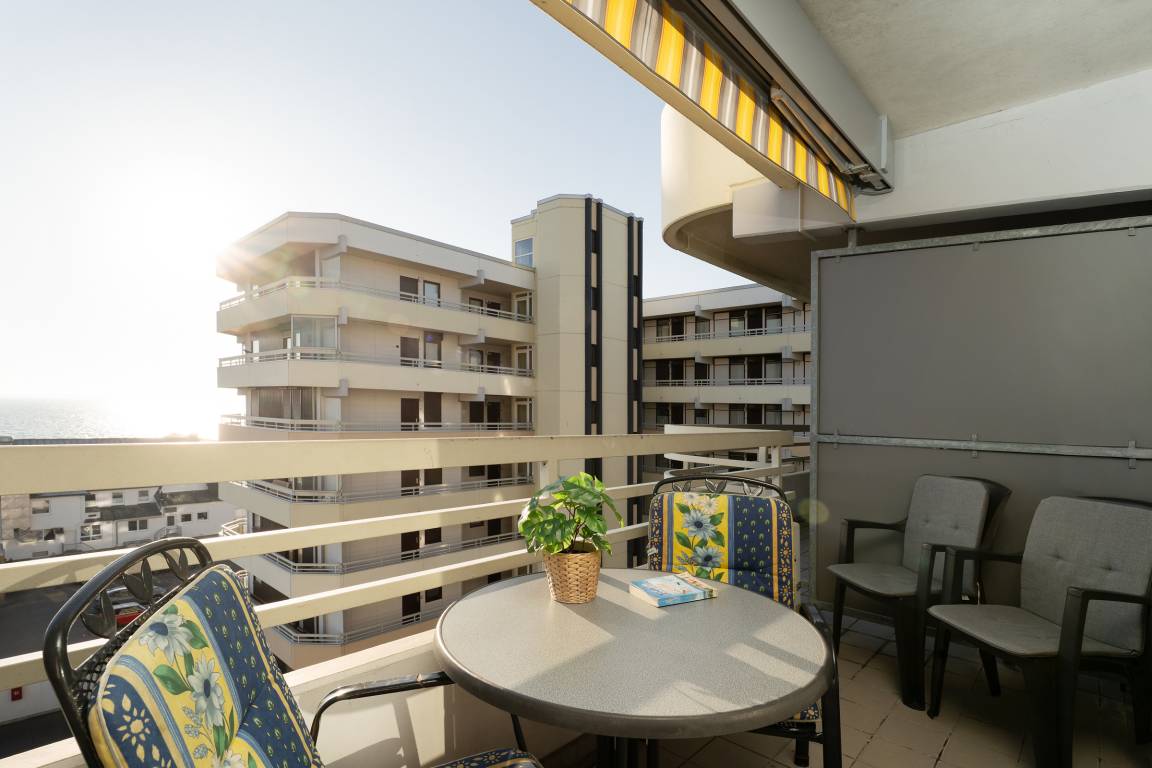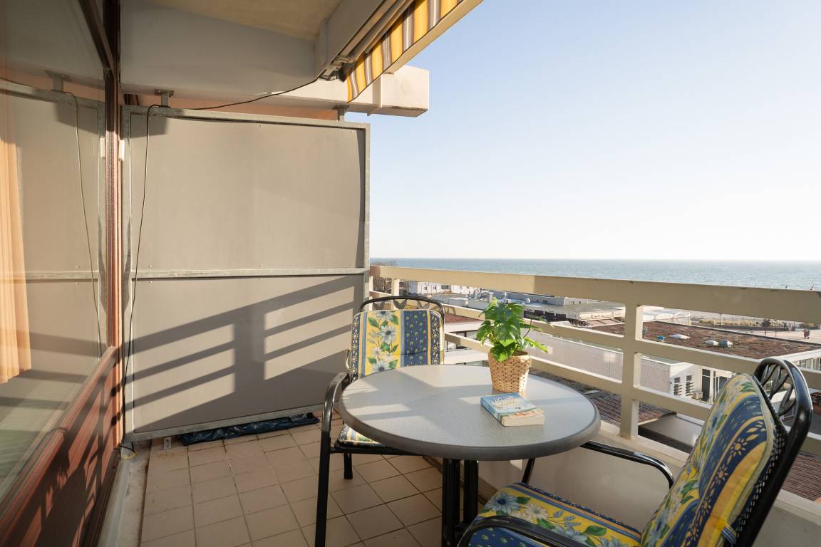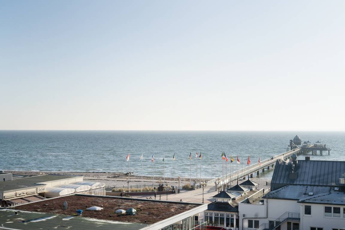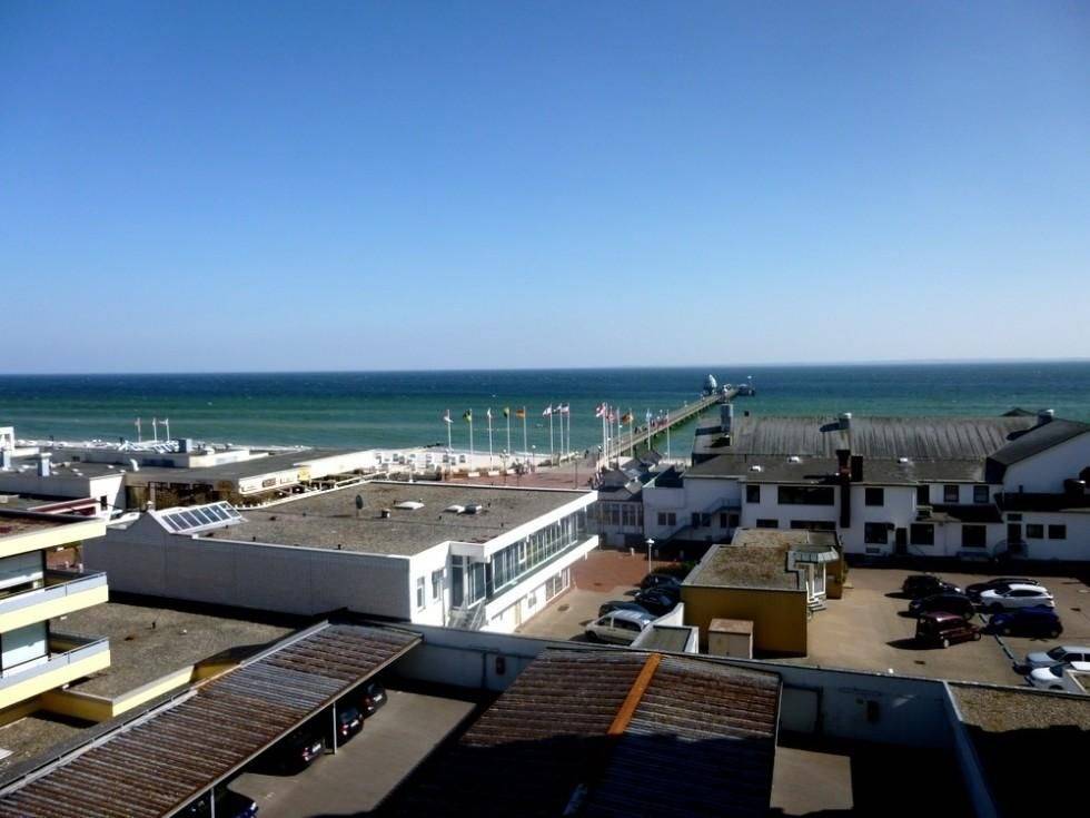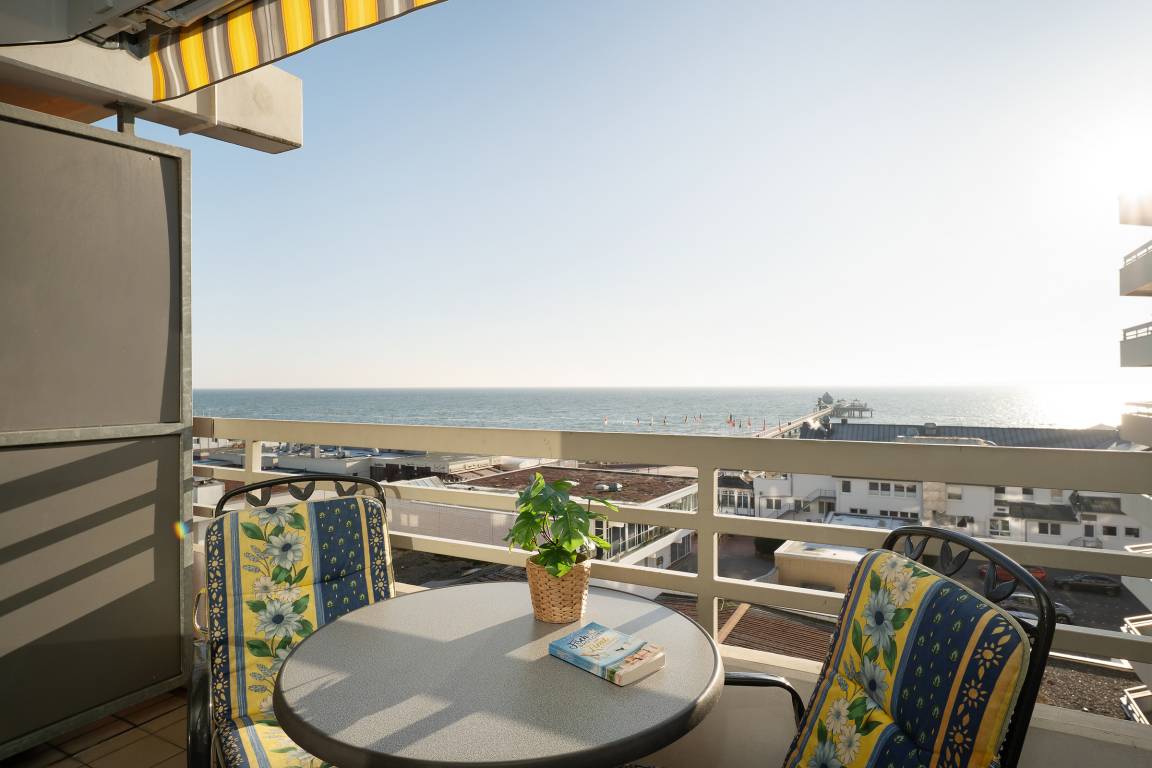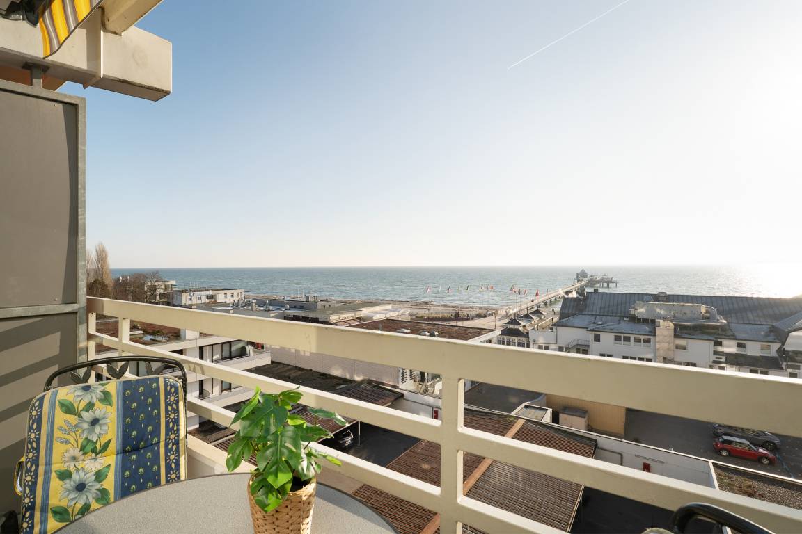 Das ist ein Blick! Die Ostsee liegt Ihnen zu Füßen. Der große, Richtung Seebrücke gerichtete, Balkon mit Gartenmöbeln lädt zum Verweilen in der Sonne ein. Verfolgen Sie die Schiffe am Horizont - Fernglas nicht vergessen!