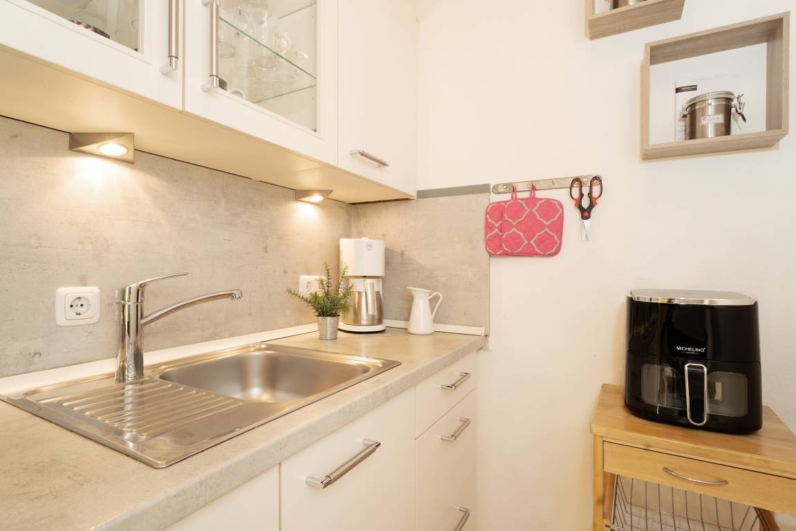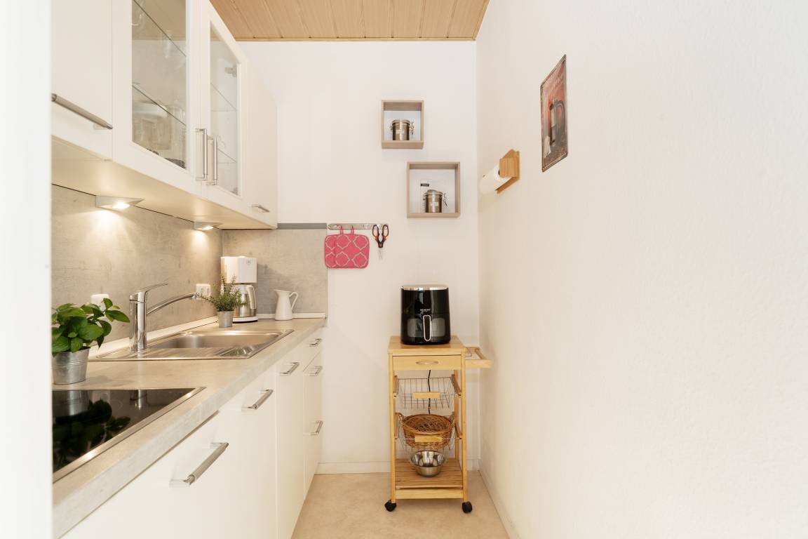 „Gute Austattung, eine Microwelle/Backofen fehlt aber. Mit einer dimmbaren Stehlampe im Wohnzimmer wären kuschelige Abende perfekt.“