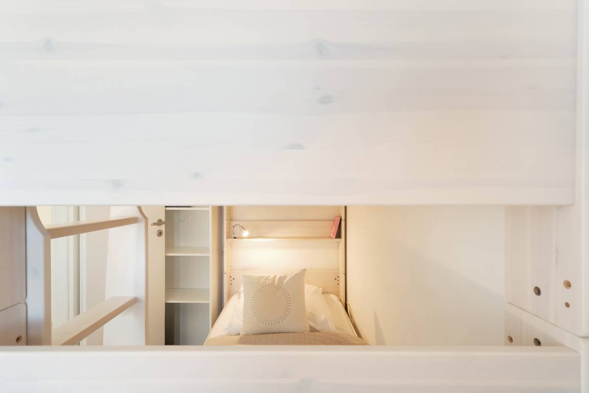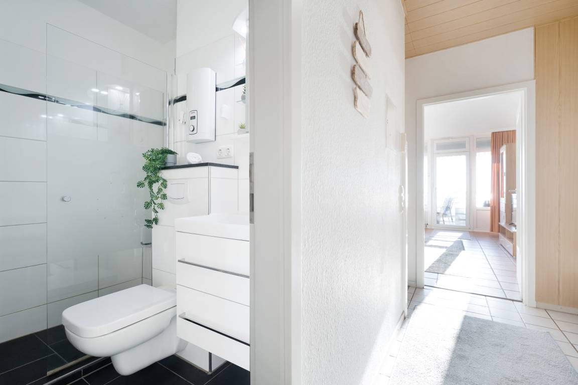 Die Wohnung ist modern und geschmackvoll eingerichtet. In der komfortablen Küche bleiben keine Wünsche offen. Von Spülmaschine, Eierkocher und Toast-/Pizzaofen bis hin zum Toaster ist alles für Ihr perfektes Dinner vorhanden. Im Wohnzimmer erwartet Sie eine gemütliche Sofaecke mit modernem Flachbildfernseher. Im angrenzenden Essbereich trifft sich die ganze Familie um schöne Abende zu verbringen. Im hellen Duschbad wird Ihnen an nichts fehlen. Vom Balkon können Sie die Boote auf der Ostsee mit einem Fernglas beobachten. Nach einem erlebnisreichen Urlaubstag sorgt das Elternschlafzimmer mit einem Doppelbett (2 Matratzen à 90x190 cm), sowie ein Etagenbett (90x200 cm) in einem separatem Schlafzimmer für Entspannung und Ruhe.