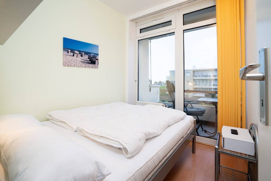Kleines Schlafzimmer mit Doppelbett (nur von einer Seite ein Einstieg) und Laminatboden. Zur Unterhaltung steht Ihnen ein Radio zur Verfügung. Die Fenster lassen sich blickdicht mit Lamellen verdunkeln.