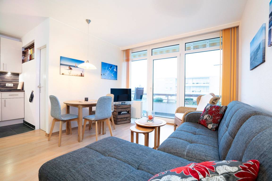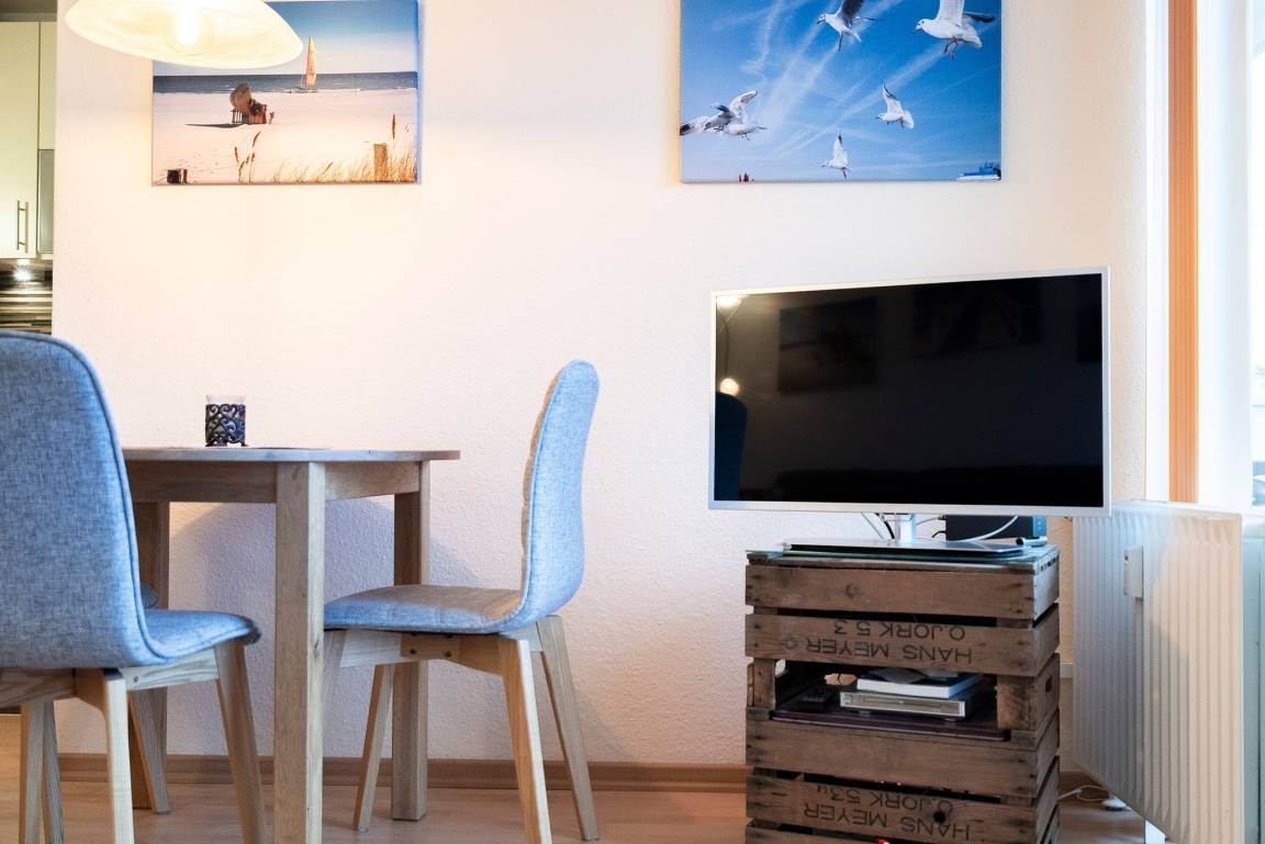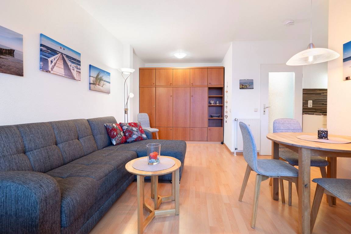 Gepflegtes, freundliches Wohn- und Esszimmer. Das Wohn-und Esszimmer ist mit einem Essplatz für 4 Personen, einem Couchtisch, einem Sofa und einem Schrankbett ausgestattet. Zur Unterhaltung steht ein Flachbildfernseher zur Verfügung. Vom Wohn-und Esszimmer direkter Zugang zum Balkon. Das Wohn-und Esszimmer ist mit Laminatboden ausgestattet, die Fenster lassen sich durch die Lamellen blickdicht verdunkeln. Ein Kleiderschrank befindet sich neben dem Schrankbett.