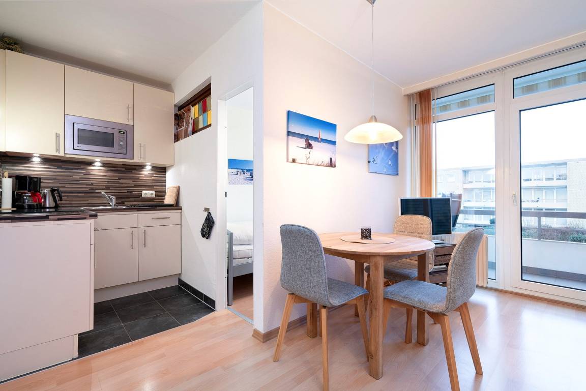 Zum Wohn- und Esszimmer offene, komplett eingerichtete Küche mit 4 Flammen Ceran-Kochfeld, Kühlschrank mit 3-Sterne Gefrierfach, Mikrowelle mit Grill-Funktion, Wasserkocher, Toaster und Kaffeemaschine.