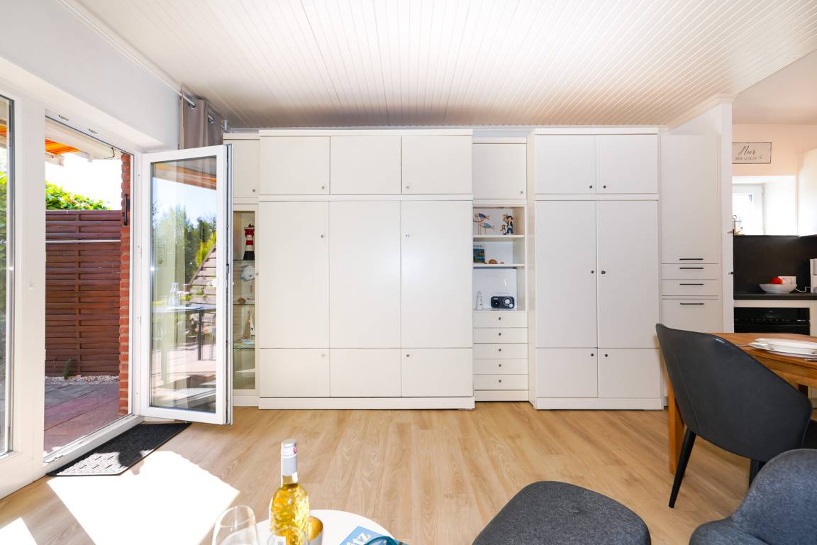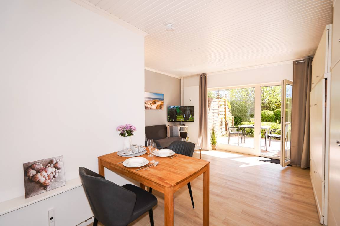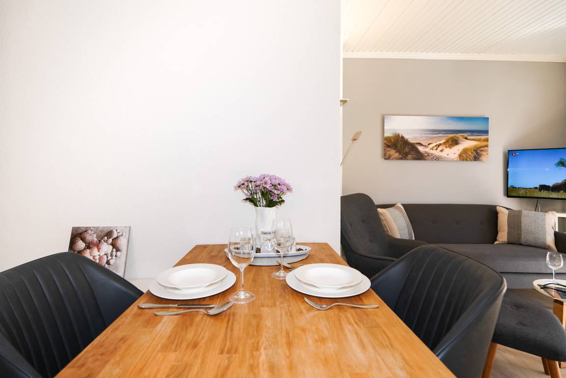 Zum Speisen, setzen Sie sich an den angrenzenden Esstisch, der für 2 Personen ausreichend Platz bietet. Oder Sie nehmen Ihren Kaffee direkt mit auf die angrenzende Terrasse, auf der Sie vom Mittag bis in den Abend hinein die Sonne genießen können. Als Schutz vor zu viel Sonne können Sie eine Markise ausfahren.