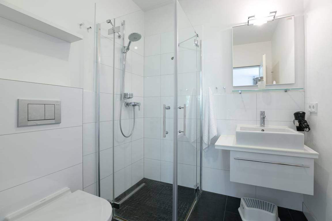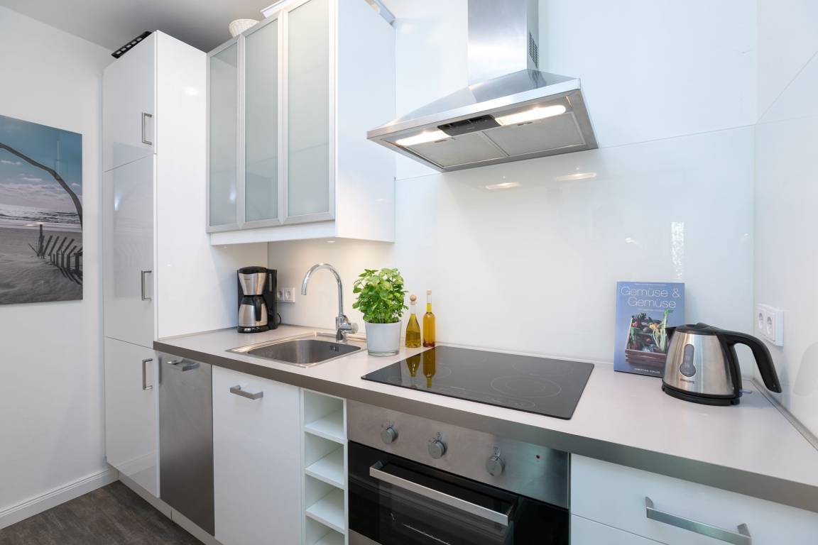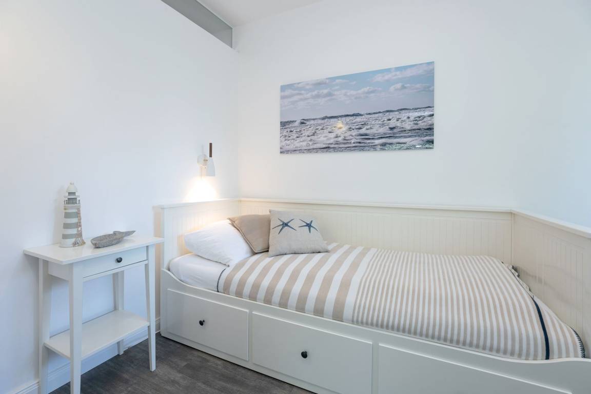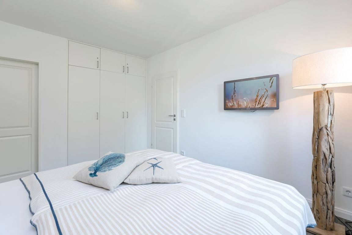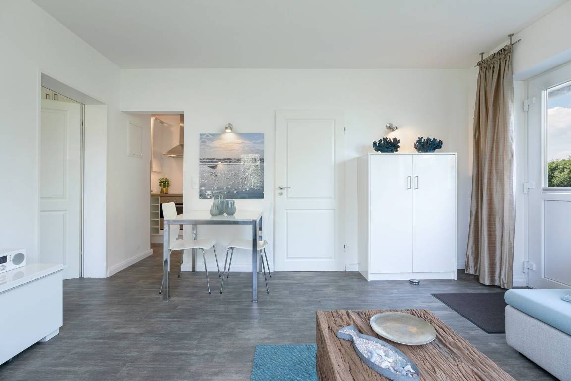 Der großzügige und lichtdurchflutete Wohnbereich mit gemütlichem Essplatz und offen angrenzender Küche ist das Herzstück dieses schönen Feriendomizils. Die moderne Küche ist offen gestaltet und perfekt in den Wohnbereich integriert, sie bietet alles, was Hobby-Koch-Herzen höher schlagen lässt. Starten Sie Ihren Tag mit einem heißen Kaffee auf der kleinen gemütlichen, möblierten Terrasse, die Sie vom Wohnbereich aus erreichen. Im separaten Schlafzimmer mit komfortablem Doppelbett (2x 90x200 cm) und einem zusätzlichem Flat-TV finden Sie ausreichend Platz für Ruhe und Erholung. Ihre Urlaubsgarderobe verstauen Sie problemlos in einem großen Wandschrank. Das Badezimmer überzeugt im modernen Stil mit einer ebenerdigen Dusche und ist vom Schlafzimmer aus zu erreichen. Das zweite Schlafzimmer verfügt über ein bequemes Einzelbett (80x200 cm). Eine Kommode bietet zusätzlichen Stauraum für Kleidung und Gepäck.