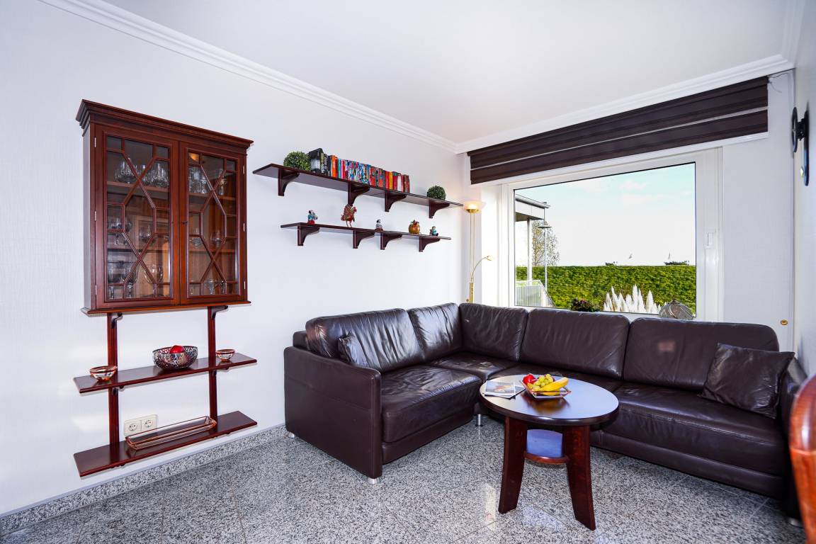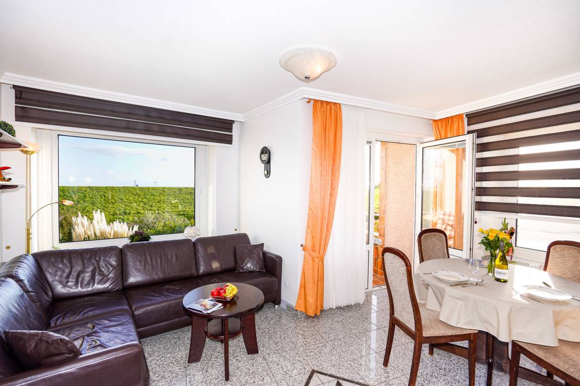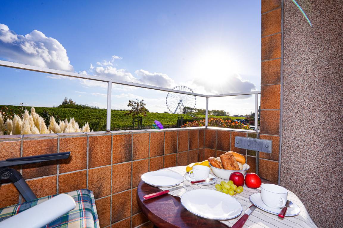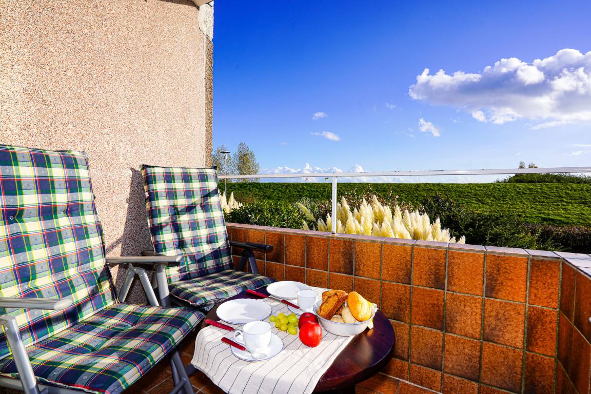 Das Wohnzimmer ist mit einem Granitboden ausgelegt und bietet Ihnen eine große Leder-Eckcouch, einen Esstisch und einen Fernseher, der zu entspannten Abenden einlädt. Erholen Sie sich nach einem aufregenden Urlaubstag auf dem Balkon mit Blick auf den Deich.