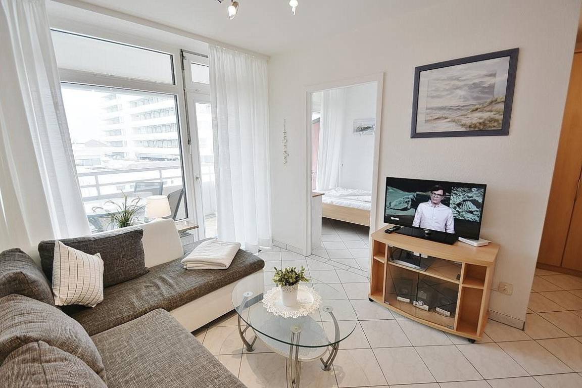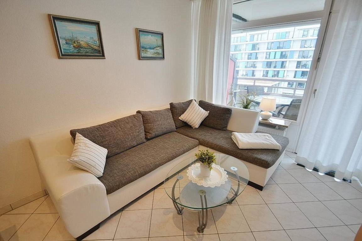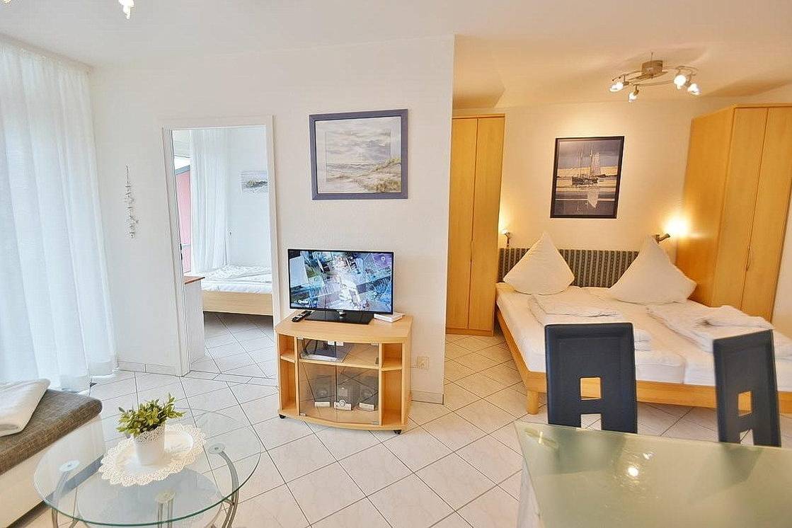 Modern eingerichtetes, freundliches Wohn- und Schlafzimmer mit Essplatz für 4 Personen. Das Wohn- und Schlafzimmer ist mit einem Doppelbett(180x200cm), zwei Kleiderschränken, einer Couch, einem Couchtisch und einem Phonowagen ausgestattet. Dieser verfügt über einen neuen Fernseher und eine Microanlage mit CD-Player und Radio. Vom Wohnbereich besteht ein direkter Zugang zum Balkon. Das Wohn- und Schlafzimmer ist mit hellen Fliesen ausgelegt. Das Fenster und die Balkontür verfügen über helle, blickdichte Vorhänge.