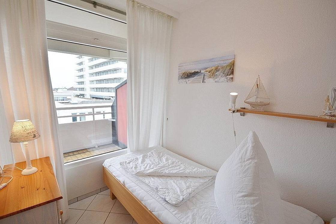 Separates, freundliches, helles Zimmer mit 2 getrennten Betten (90x190cm) und einer Kommode. Das Kinderzimmer ist ebenfalls hell gefliest. Helle, blickdichte Vorhänge bieten Sichtschutz am Fenster zum Balkon.