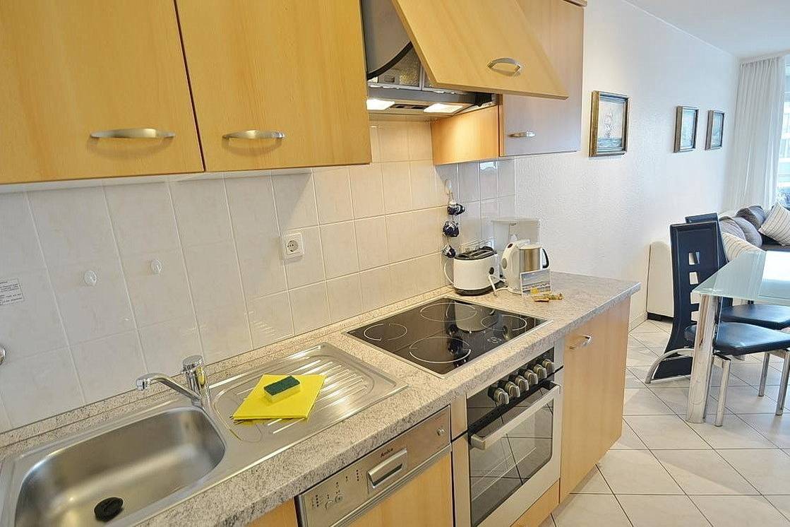 Komplett ausgestattete, separate Küche, die an den Essbereich anschließt. Die Küche verfügt über einen E-Herd mit Ceranfeld, Backofen, Kühlschrank mit kleinem Gefrierfach, Toaster, Mikrowelle, Kaffeemaschine, Wasserkocher und Geschirrspülmaschine.