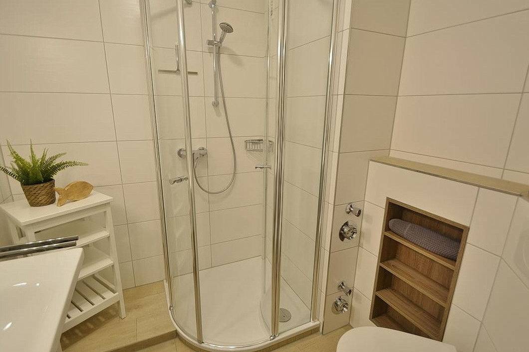 Modernes, 2018 komplett renoviertes, hell gefliestes Bad mit Dusche, WC, Waschtisch und ausreichend Ablagen.