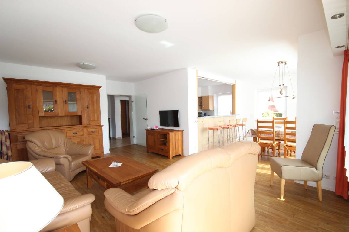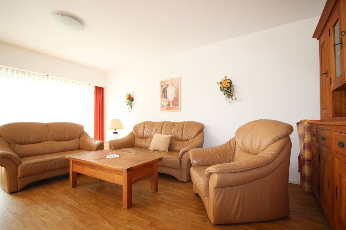 Im hellen Wohnbereich befindet sich eine gemütliche Ledergarnitur, Massivholzmöbel, Essplatz & TV. Hier ist der Zugang zur möblierten Süd-Terrasse.