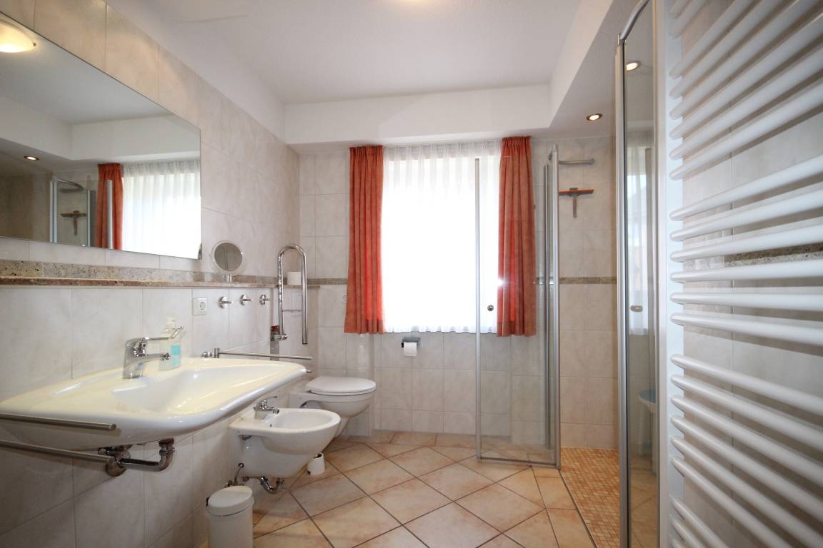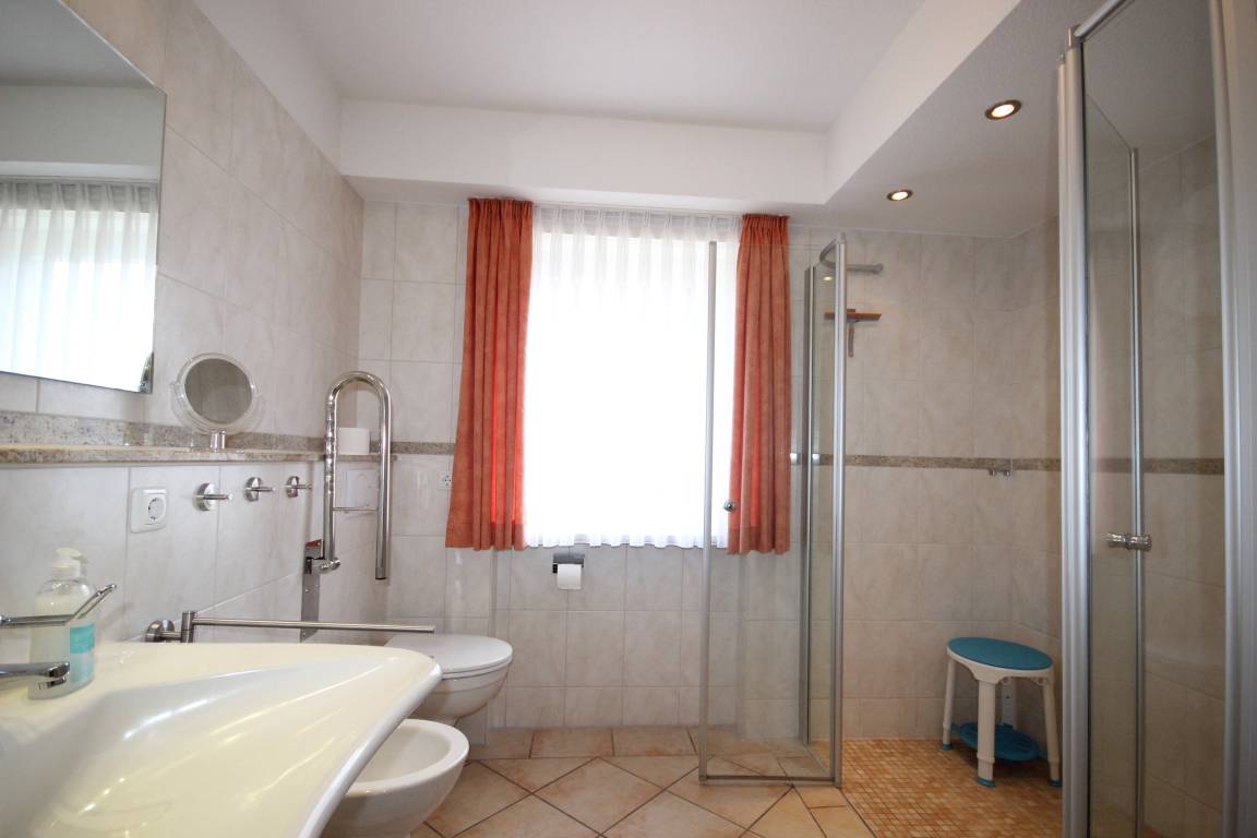 Ein barrierefreies Bad mit großzügiger Dusche, WC, Waschtisch und Bidet.