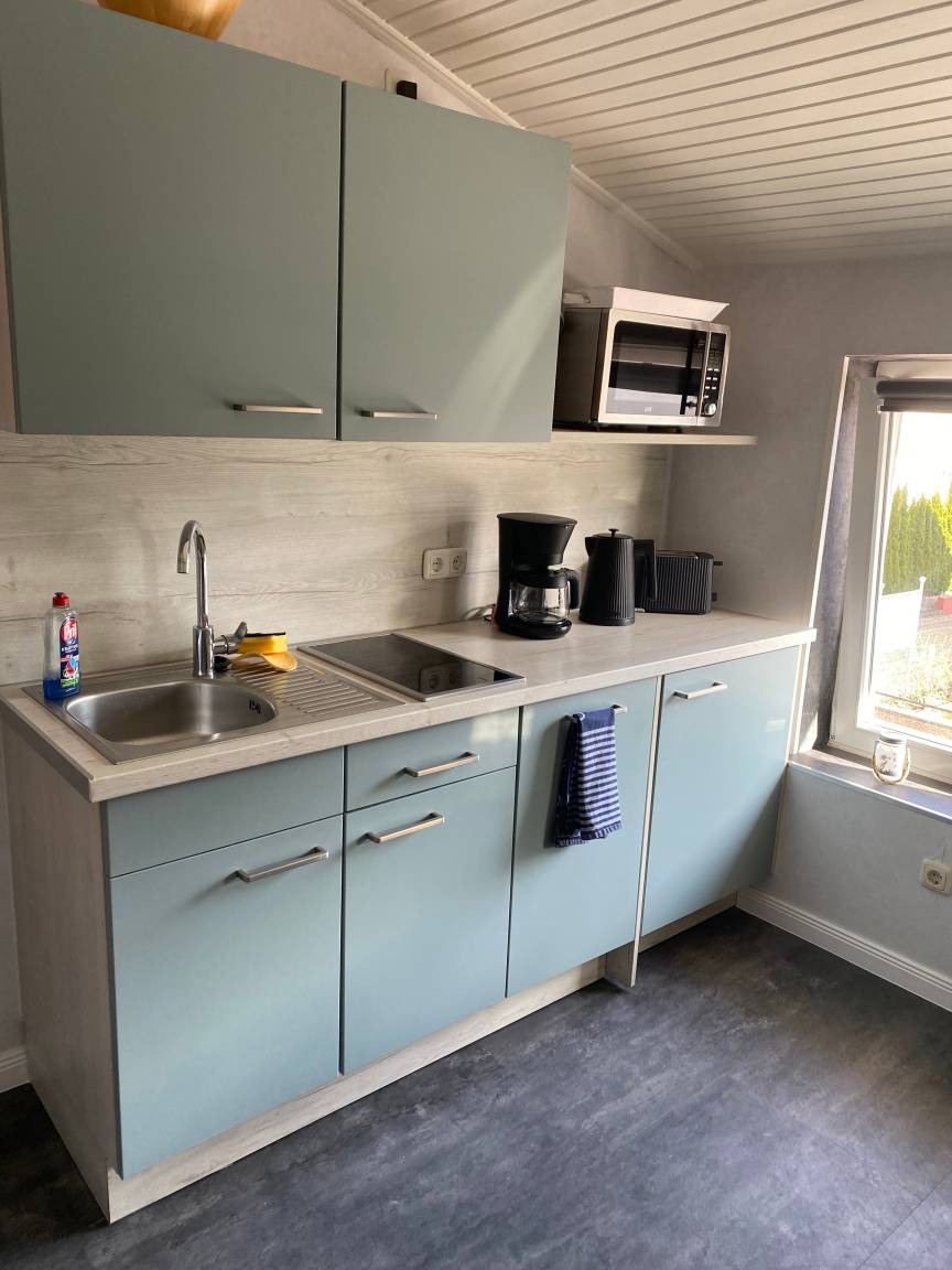 Voll ausgestattete Küchenzeile mit 2 Kochfeldern, Kühlschrank mit Gefrierfach, Mikrowelle, Spülmaschine, Kaffeemaschine, Toaster und Wasserkocher