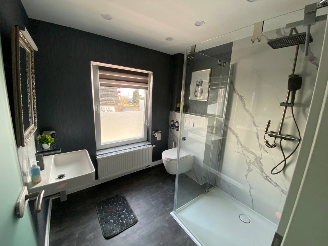 Modernes Bad mit Spiegel, ebenerdige Dusche und Föhn