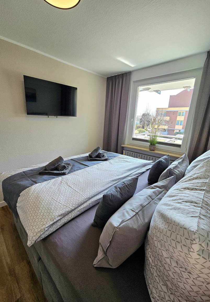 Das separate Schlafzimmer ist mit einem komfortablen Doppelbett und einem Fernseher ausgestattet und lädt zum Ausruhen und Abschalten ein.