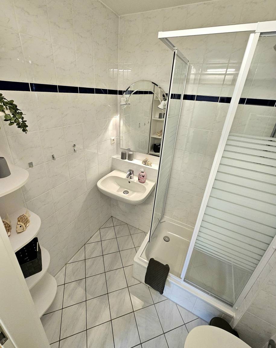 Das stilvoll eingerichtete Badezimmer verfügt über eine Dusche.