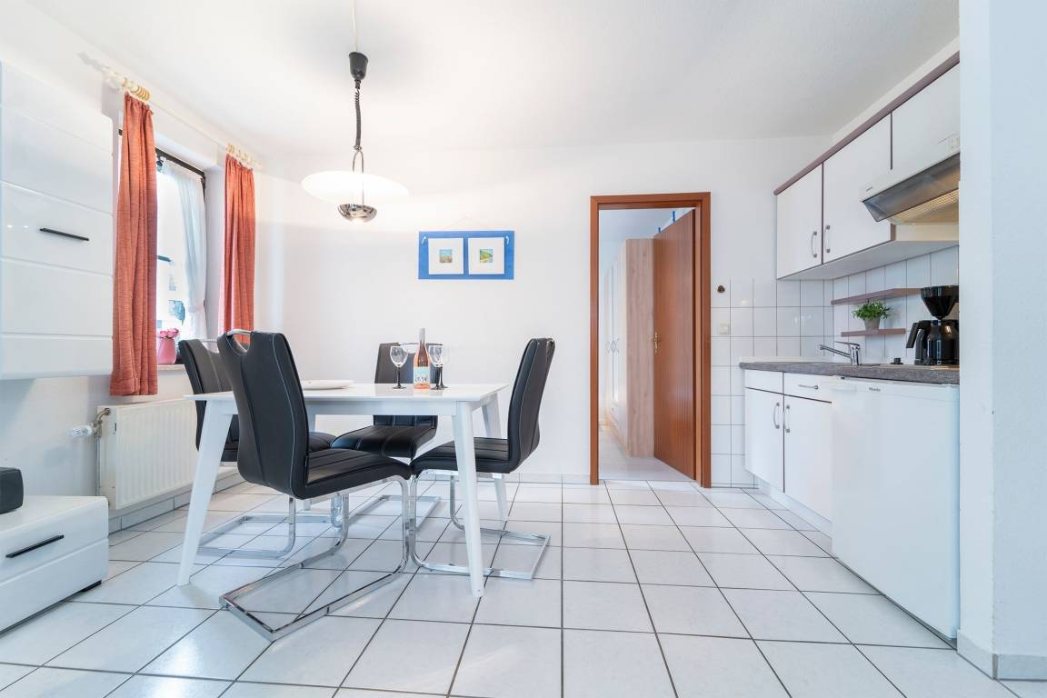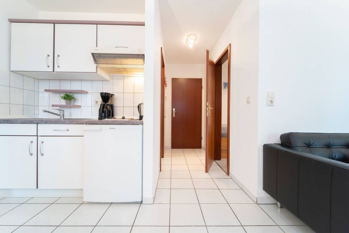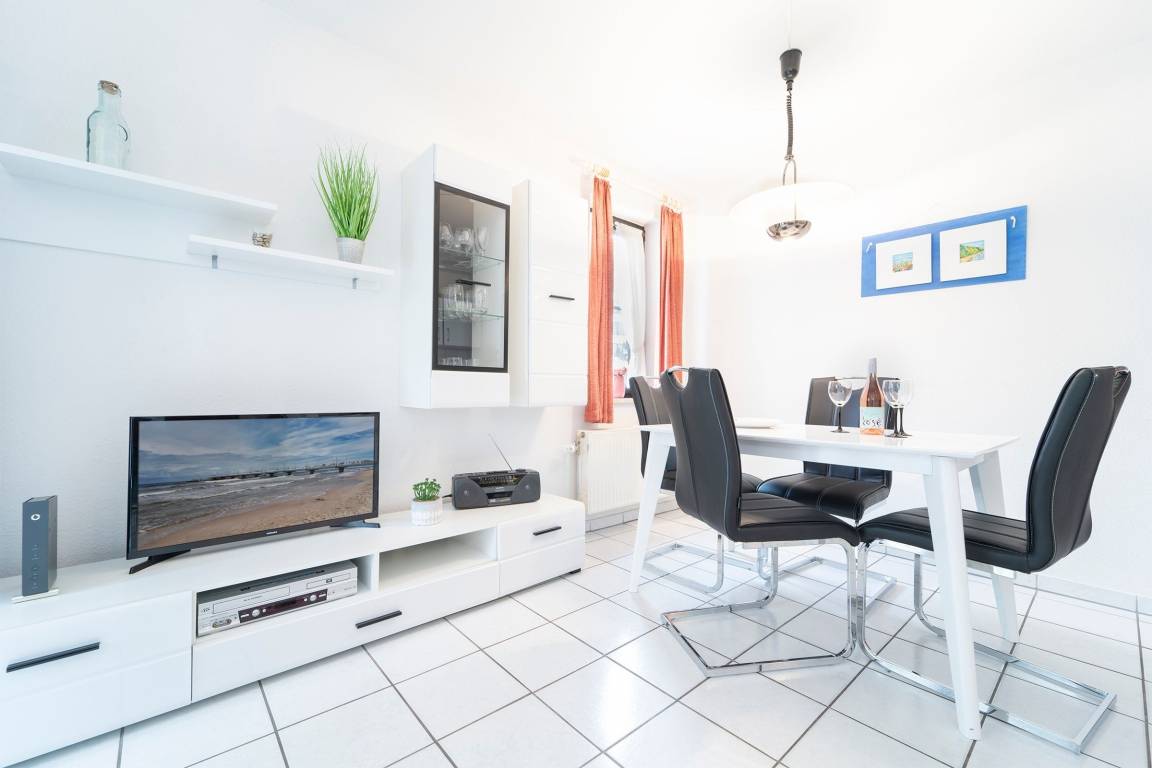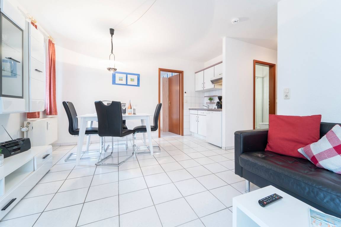 Durch einen kleinen Flur betreten Sie den Wohnraum mit integrierter, offener Küche. Mit der gemütlichen Couch, dem Flachbildfernseher, DVD-Player, dem WLAN-Anschluss und dem großzügigen Esstisch haben Sie viele Möglichkeiten Ihren Urlaub bunt zu gestalten. In der überschaubaren Küche mit 2-Plattenherd, Kühlschrank mit Gefrierfach, Kaffeemaschine, Wasserkocher und Toaster können Sie sich kleine Mahlzeiten zaubern. Auf einer kleinen möblierten Terrasse können Sie die frische Ostseeluft schnuppern. Zur Nachtruhe ziehen Sie sich in das separate Hauptschlafzimmer mit Doppelbett (2x 90x200 cm) und großem Kleiderschrank zurück. Ein zweites Schlafzimmer für einen dritten Urlaubsgast lädt mit einem Einzelbett (90x200 cm) zum Träumen ein. Nach einer Dusche im hellgefliesten Bad können Sie dynamisch in den Urlaubstag starten.