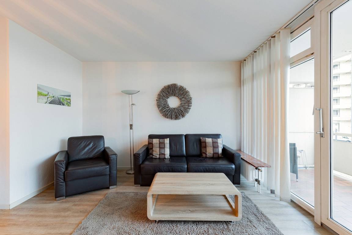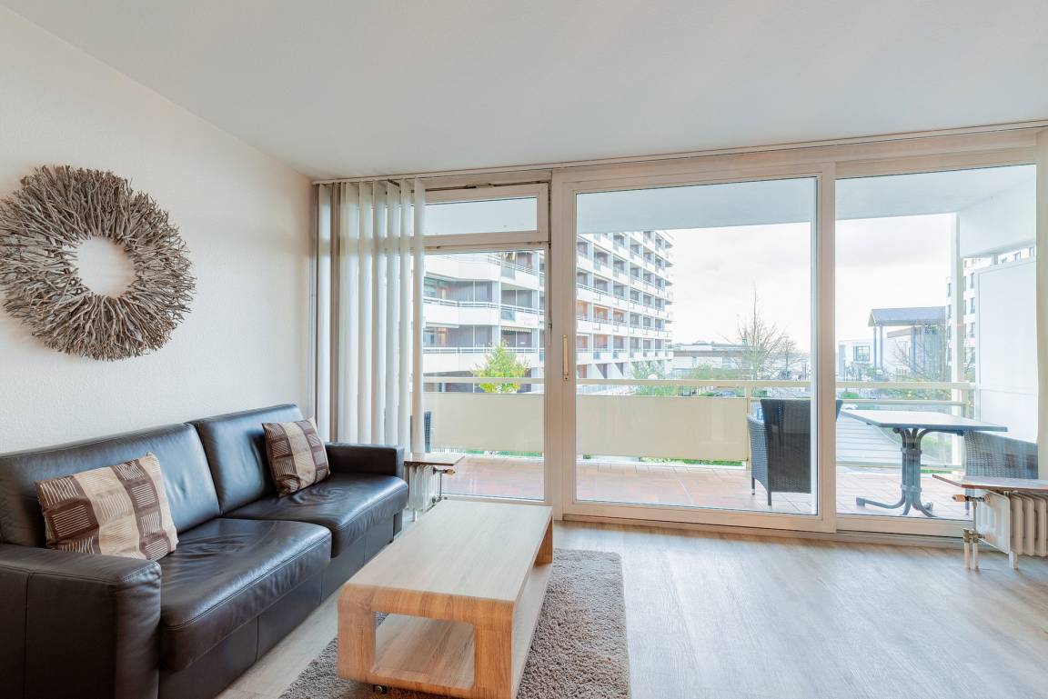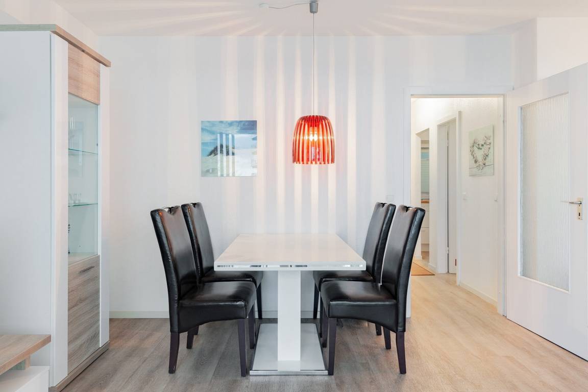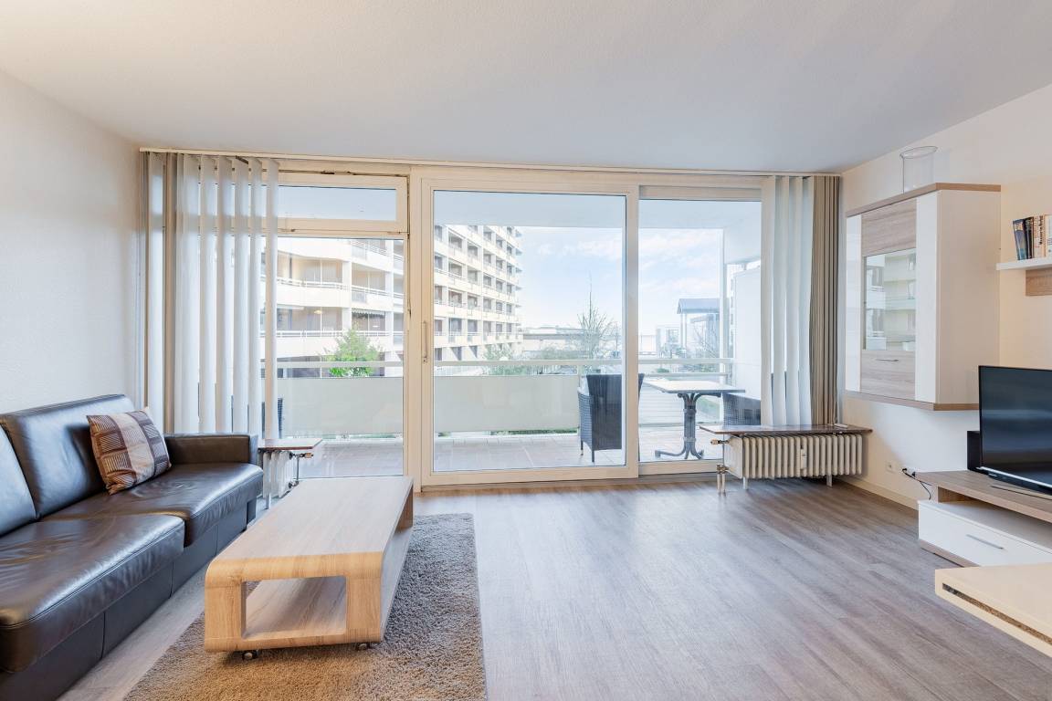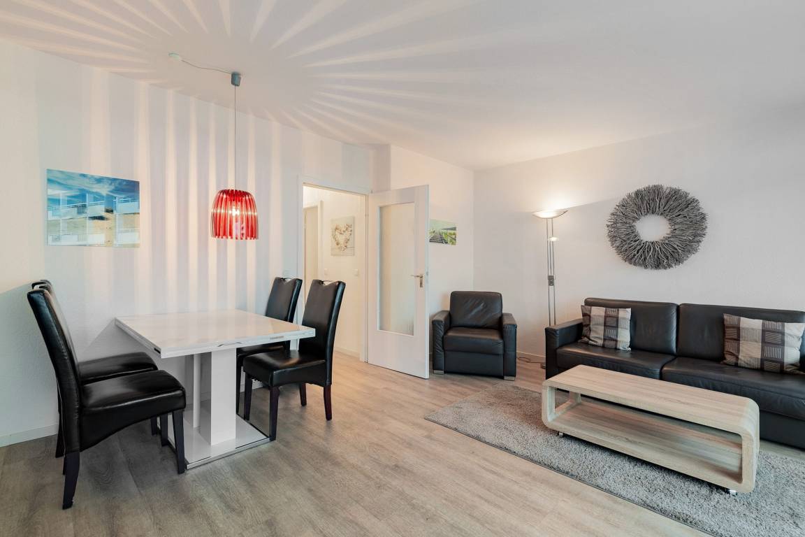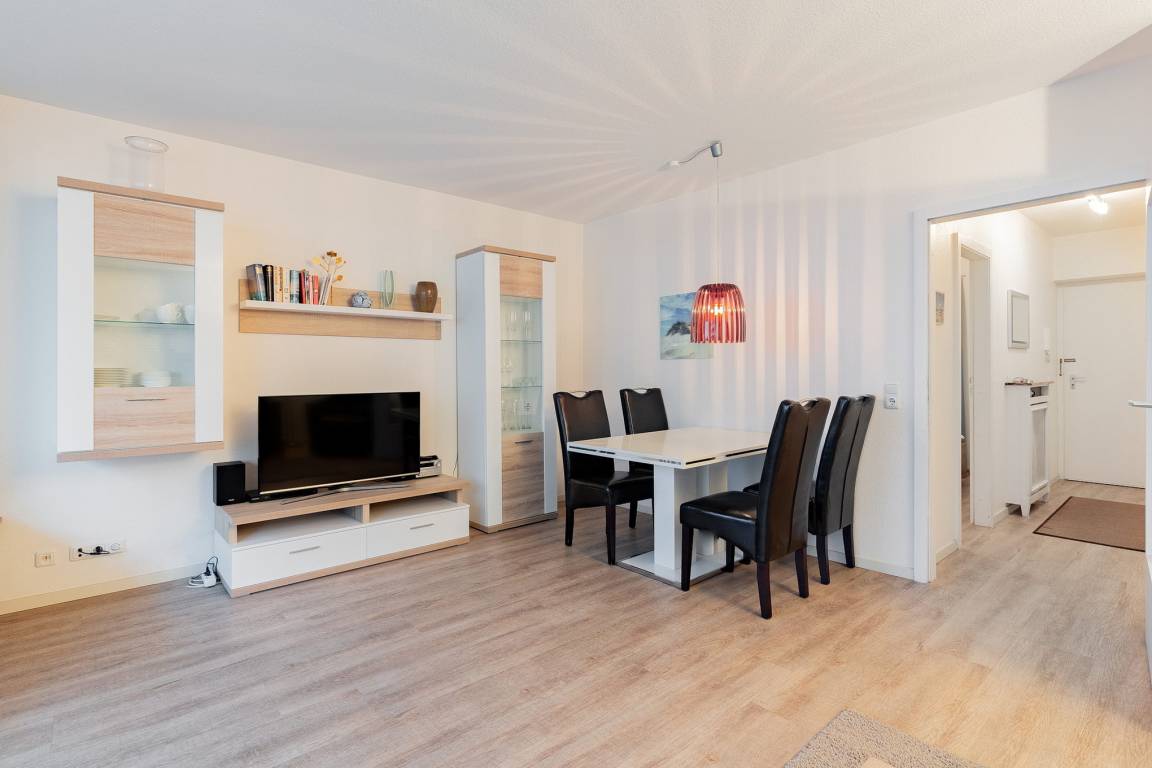 Helles, freundliches, modern eingerichtetes Wohn- und Esszimmer mit direktem Zugang zum Balkon in süd-östliche Richtung. Das Wohn- und Esszimmer ist mit einer Schlafcouch (150x190cm), einem Sessel, einem Couchtisch, einer Wohnzimmerschrankwand und einem Essplatz für 4 Personen ausgestattet. Zur Unterhaltung stehen ein Flachbildfernseher und eine Mini-Stereoanlage mit CD-Player zur Verfügung. Das Wohn- und Esszimmer ist mit Designer-Planken ausgelegt; die Fensterfront lässt sich durch Lamellen blickdicht verdunkeln.