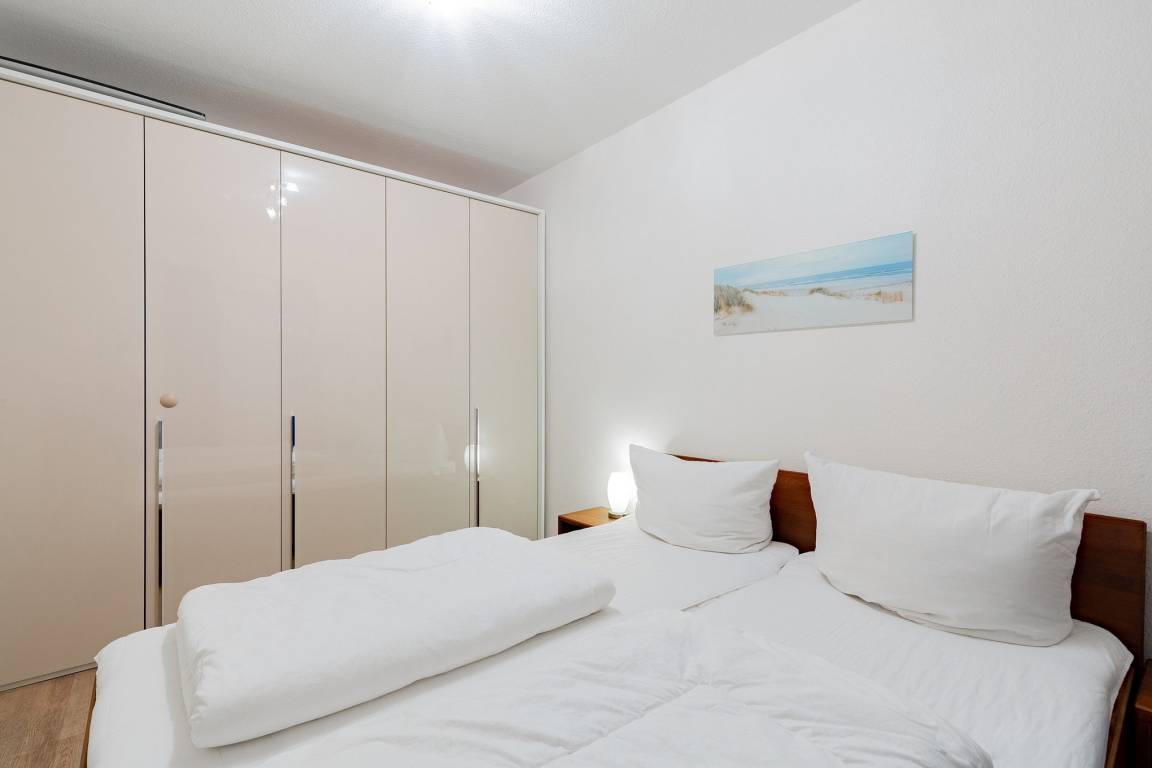 Modern eingerichtetes, separates Schlafzimmer mit einem Doppelbett (2x 80x200cm), 2 Nachttischen und einem 5-türigen Kleiderschrank. Das Zimmer ist mit Designer-Planken ausgelegt; das Fenster zum Laubengang lässt sich durch ein Außenrollo und ein Innenrollo vollständig verdunkeln.