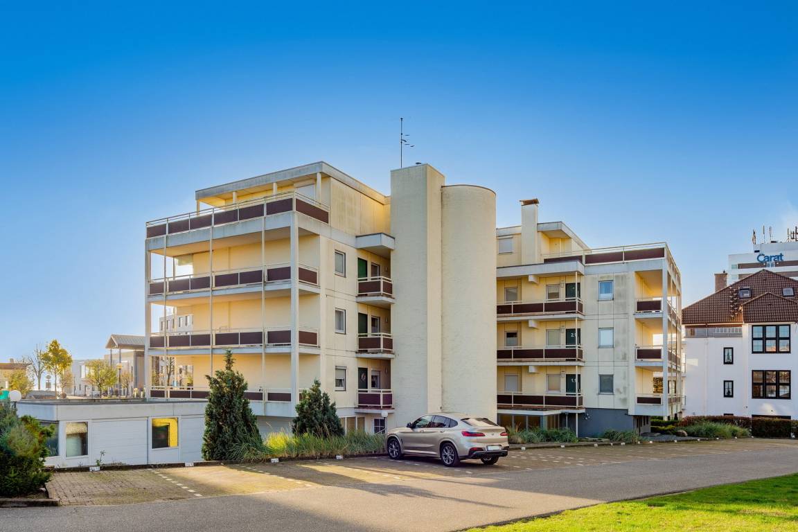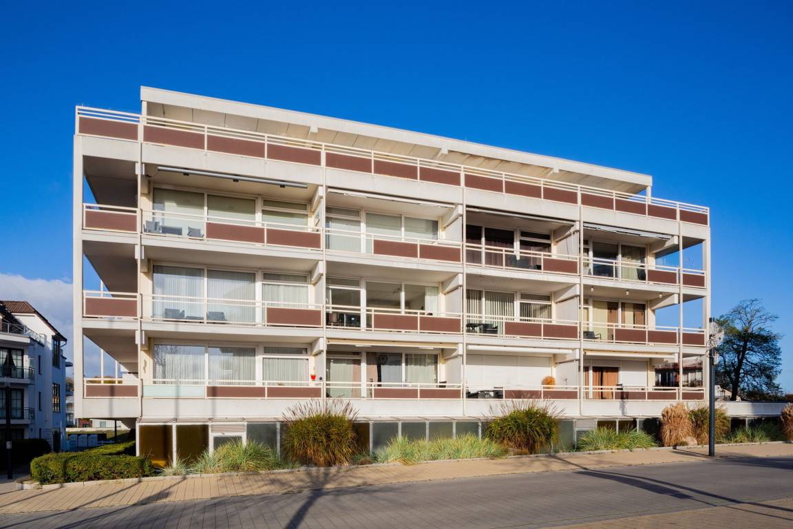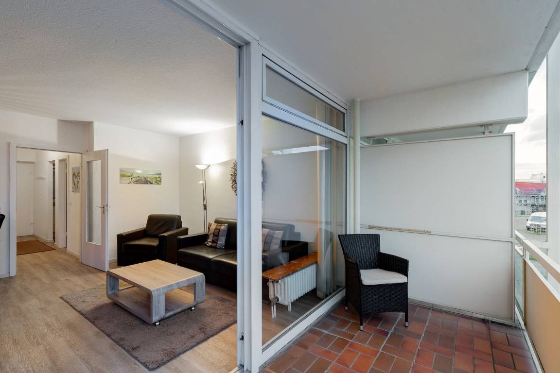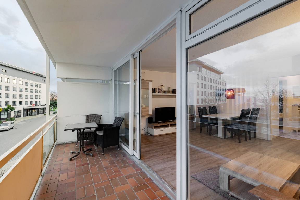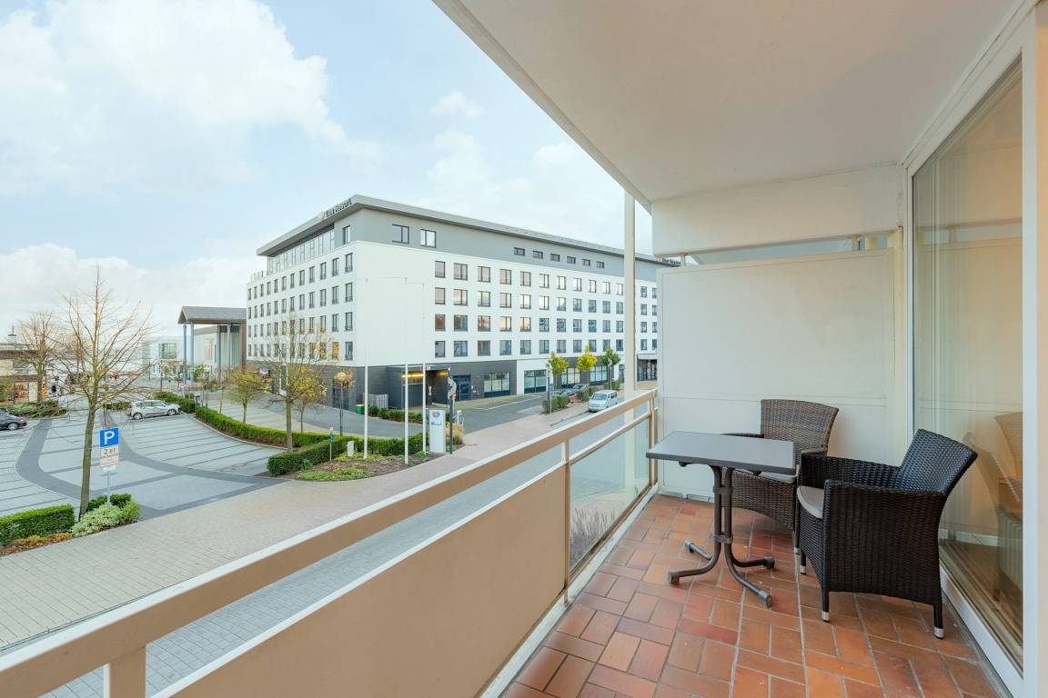 Balkon in süd-östliche Richtung, PKW-Stellplatz hinter dem Gebäude, Fahrstuhl. Teilseeblick.