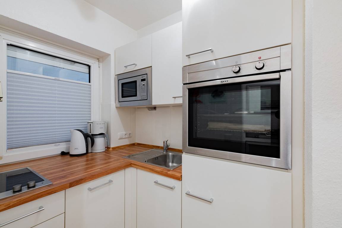 Moderne, komplett ausgestattete separate Küche mit Fenster zum Laubengang. Die Küche ist mit einem 2 Platten Cerankochfeld, einem Backofen, einem Kühlschrank mit kleinem 3-Sterne Gefrierfach, einer Mikrowelle, einer Spülmaschine, einer Kaffeemaschine, einem Wasserkocher und einem Toaster ausgestattet.