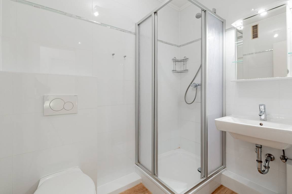Modernes, freundliches Bad mit Dusche, WC und Waschbecken.