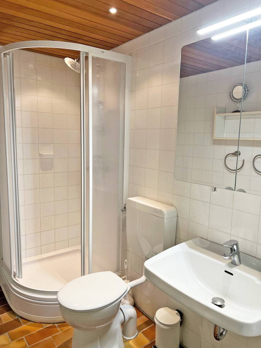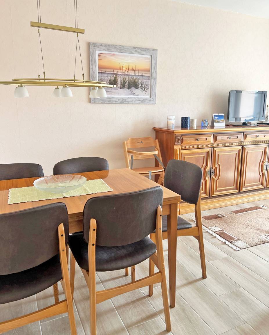 Der Wohnraum mit einer gemütlichen Eckcouch bietet Entspannung, des Weiteren lassen der Flachbild-TV mit Kabelanschluss sowie ein Radio mit CD-Player, reichlich Brettspielen und Büchern keine Langeweile aufkommen. Zur Verfügung steht Ihnen hier ein Esstisch mit Stühlen. Vom Wohnraum gelangen Sie auf die herrliche, möblierte Süd-Loggia, wo Sie bereits ab Mittag bis in die Abendstunden die Sonne genießen können.