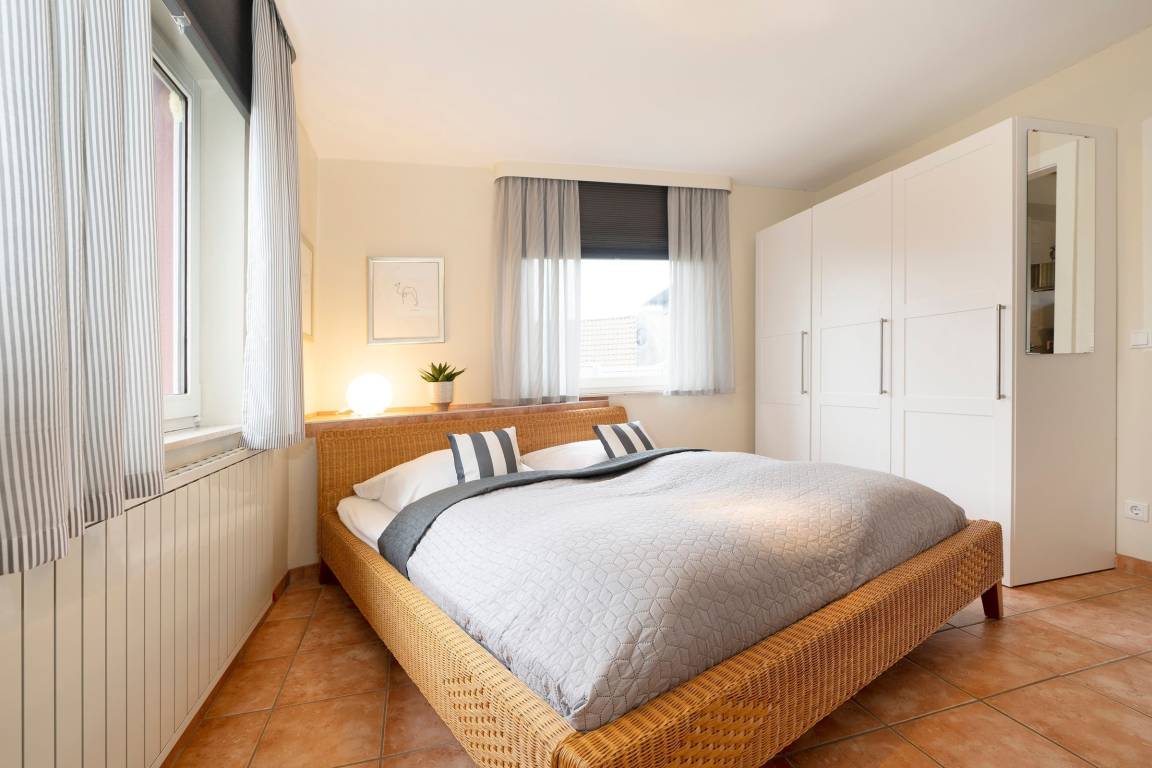 Erdgeschoss: Die offene Wohnküche begrüßt Sie mit Fernsehbereich und bequemer Eckcouch, sowie gemütlichem Essplatz für bis zu 4 Personen. Die gute Küchenausstattung ermöglicht problemlos die Zubereitung leckerer Ferienmahlzeiten. Ebenfalls im unteren Bereich der Wohnung befindet sich das schöne Badezimmer, welches mit warmen Farben und hochwertiger Ausstattung begeistert. Vom Wohnbereich ab geht es in das Schlafzimmer mit komfortablem Doppelbett (2x90x200cm) und geräumigem Kleiderschrank für Ihre Ferienkleidung. Obergeschoss: Von dort aus führt schließlich eine Treppe (mit Treppenschutzgitter für die kleinen Gäste) in den offenen Galeriebereich mit zwei Einzelbetten (je 90x200cm), Nachtschränkchen und Dachschrägenfenster. Lassen Sie den Tag auf der Terrasse mit eigenem Strandkorb entspannt ausklingen. Ein Domizil mit wahrer Wohlfühlgarantie!