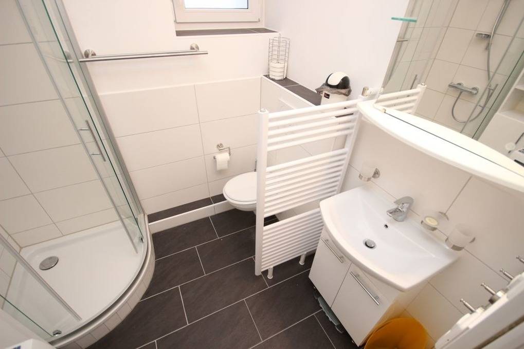 Schönes modernes Bad mit Duschkabine, Waschmaschine, WC & Waschbecken.